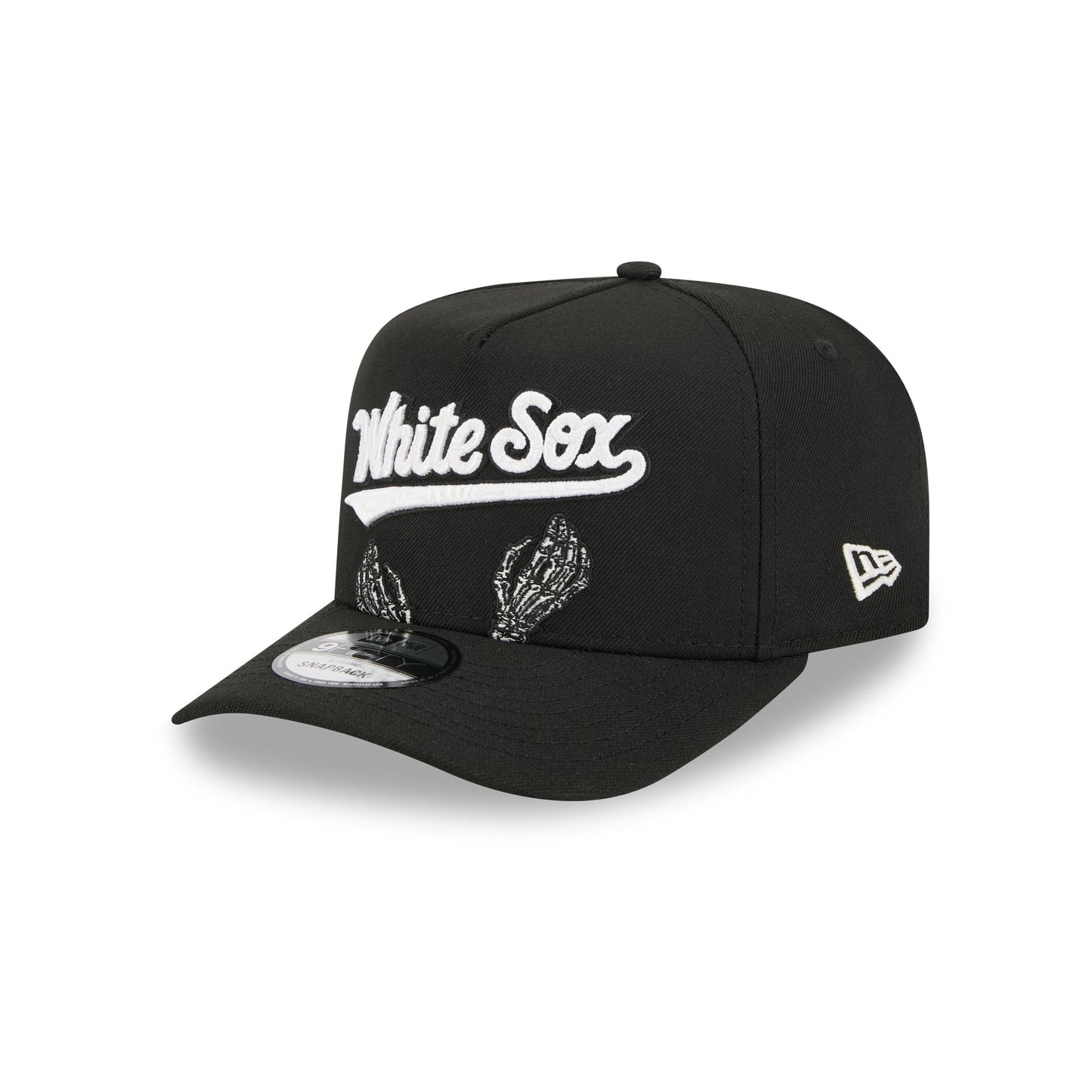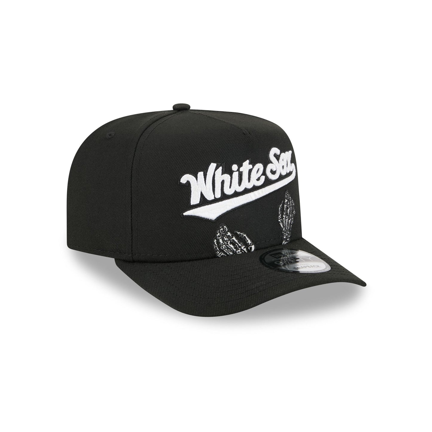 The Chicago White Sox Skeletal Script 9FIFTY A-Frame Snapback features a glow-in-the-dark embroidered White Sox wordmark and skeleton hands at the front with an MLB Batterman logo at the right of a snapback closure at the rear and a gray undervisor.