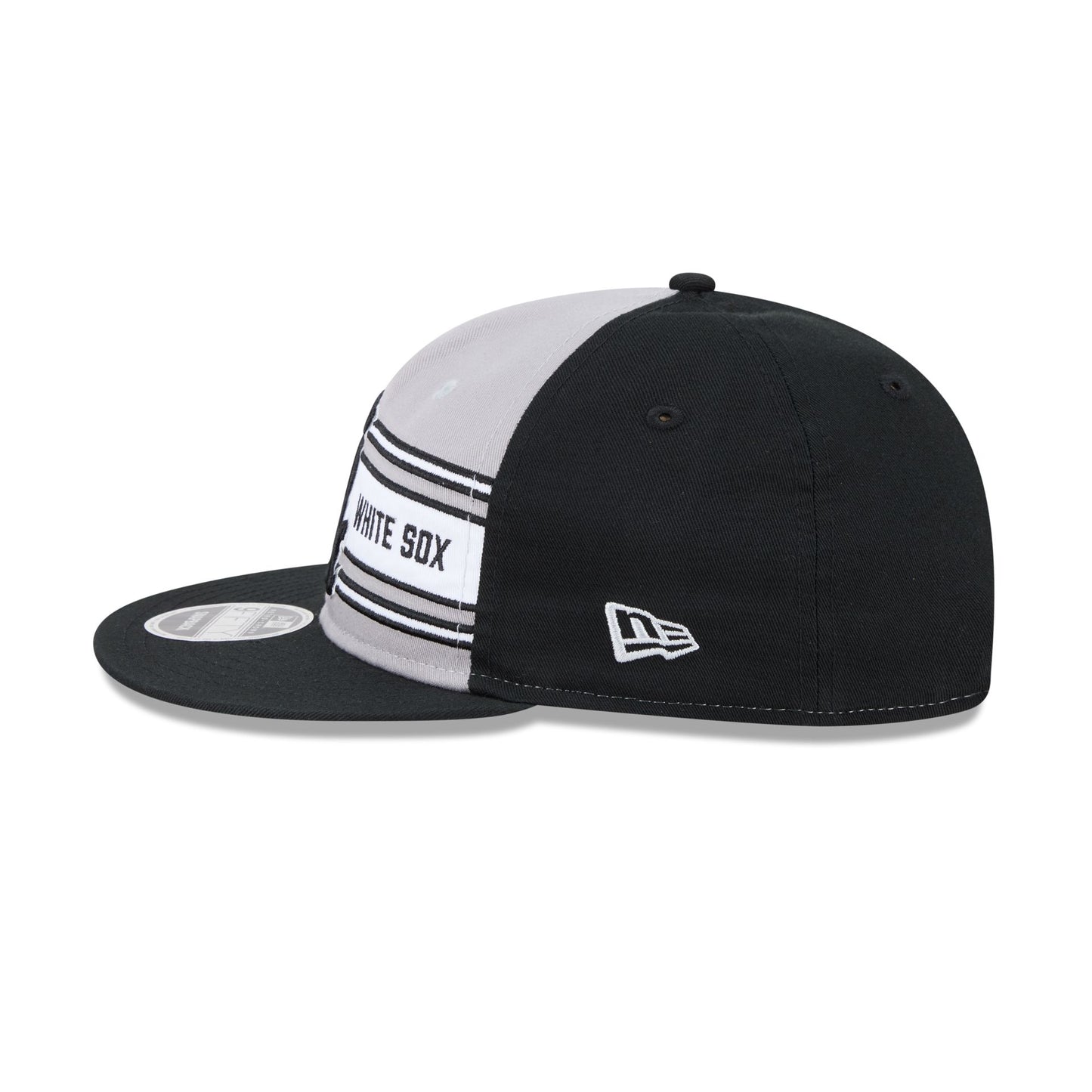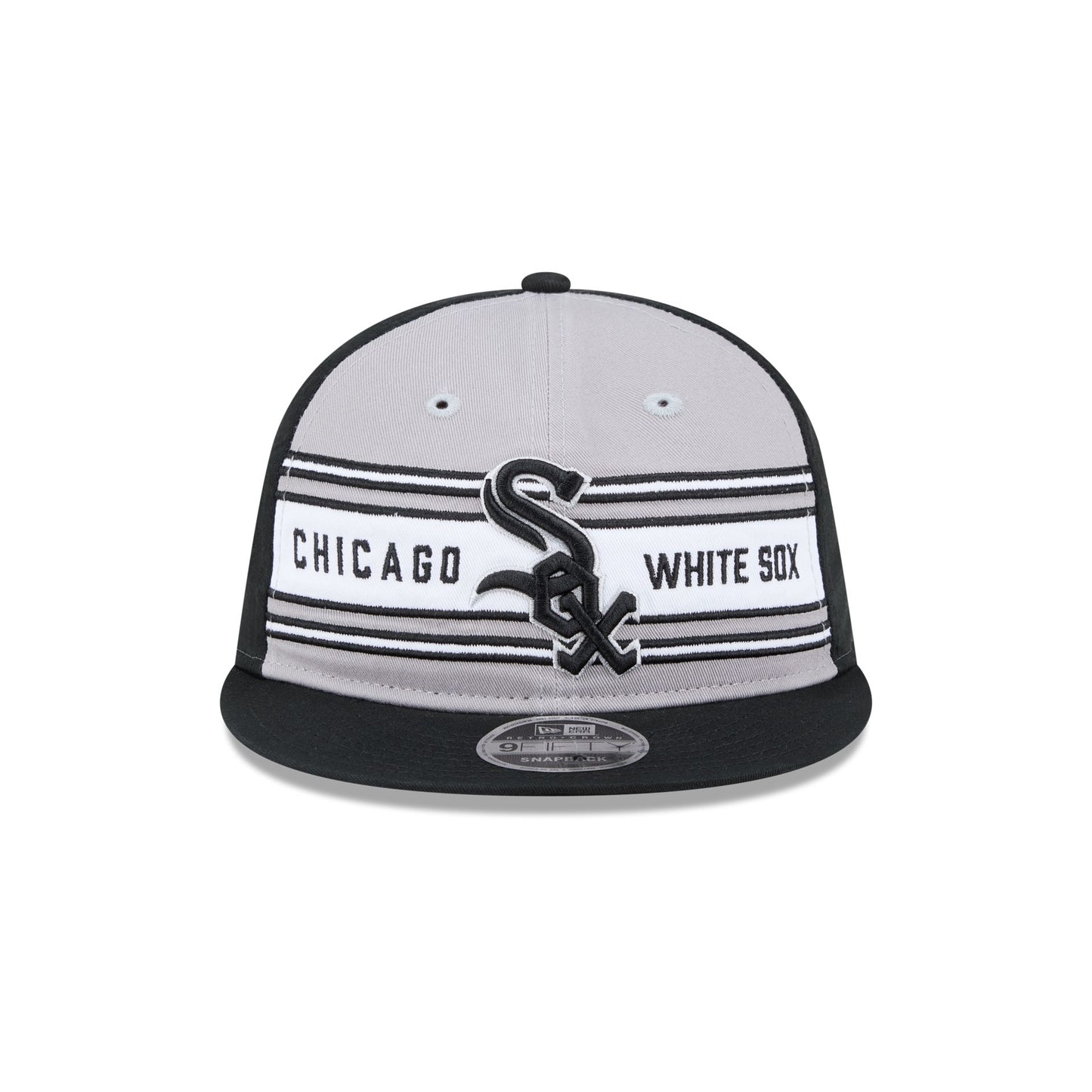 The Chicago White Sox Team Stripes Retro Crown 9FIFTY Snapback features an embroidered White Sox team stripe logo and wordmark at the front panels with an adjustable snapback closure at the rear.