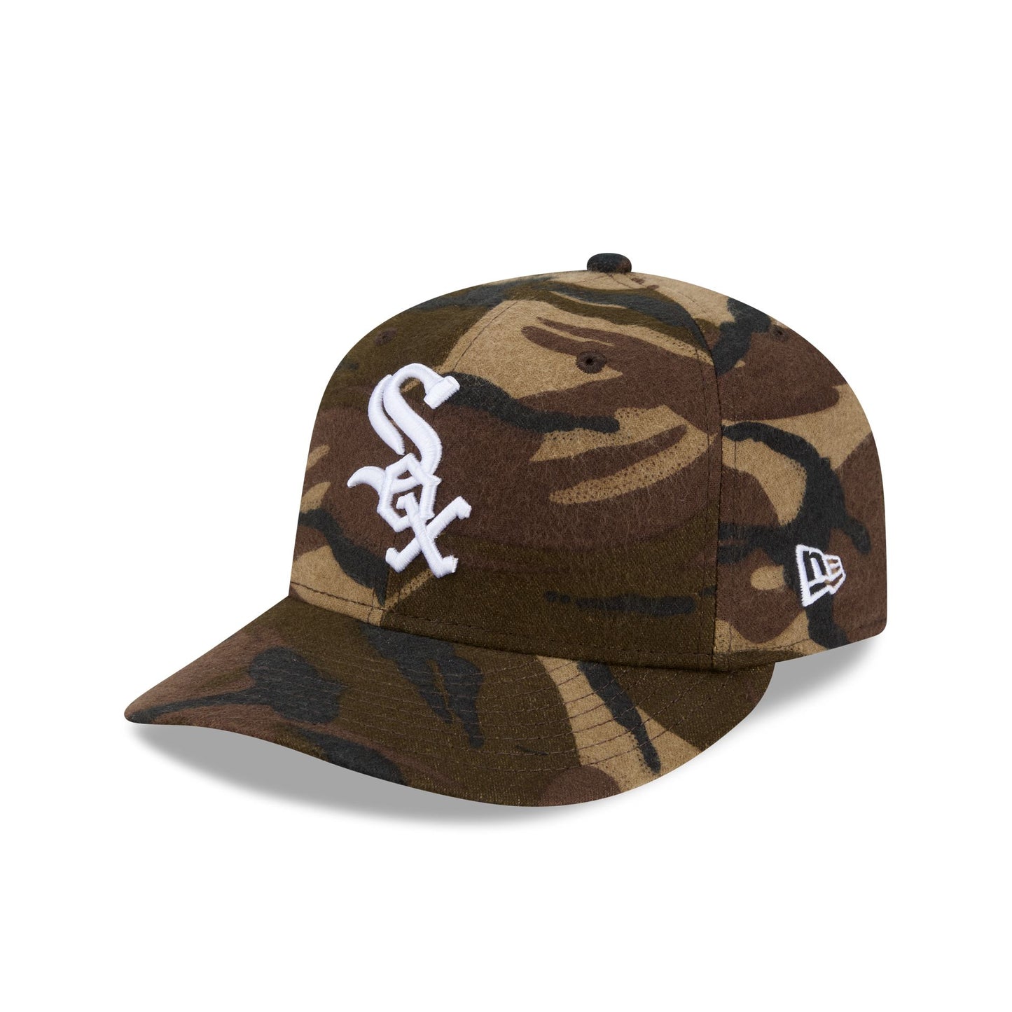 The Chicago White Sox Three Looms Camo Pre-Curve 59FIFTY Fitted Cap features an embroidered White Sox logo at the front panels with a matching MLB Batterman logo at the rear, a pre-curved visor, and a green undervisor.