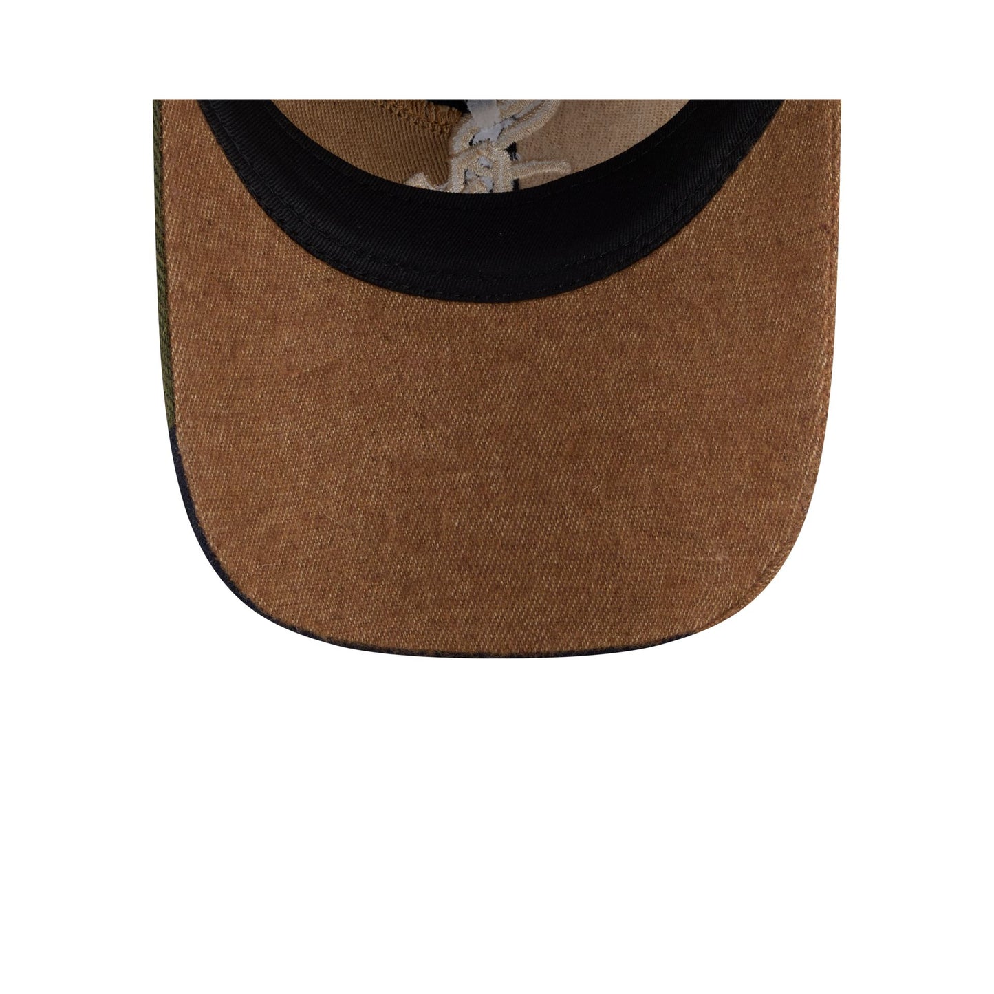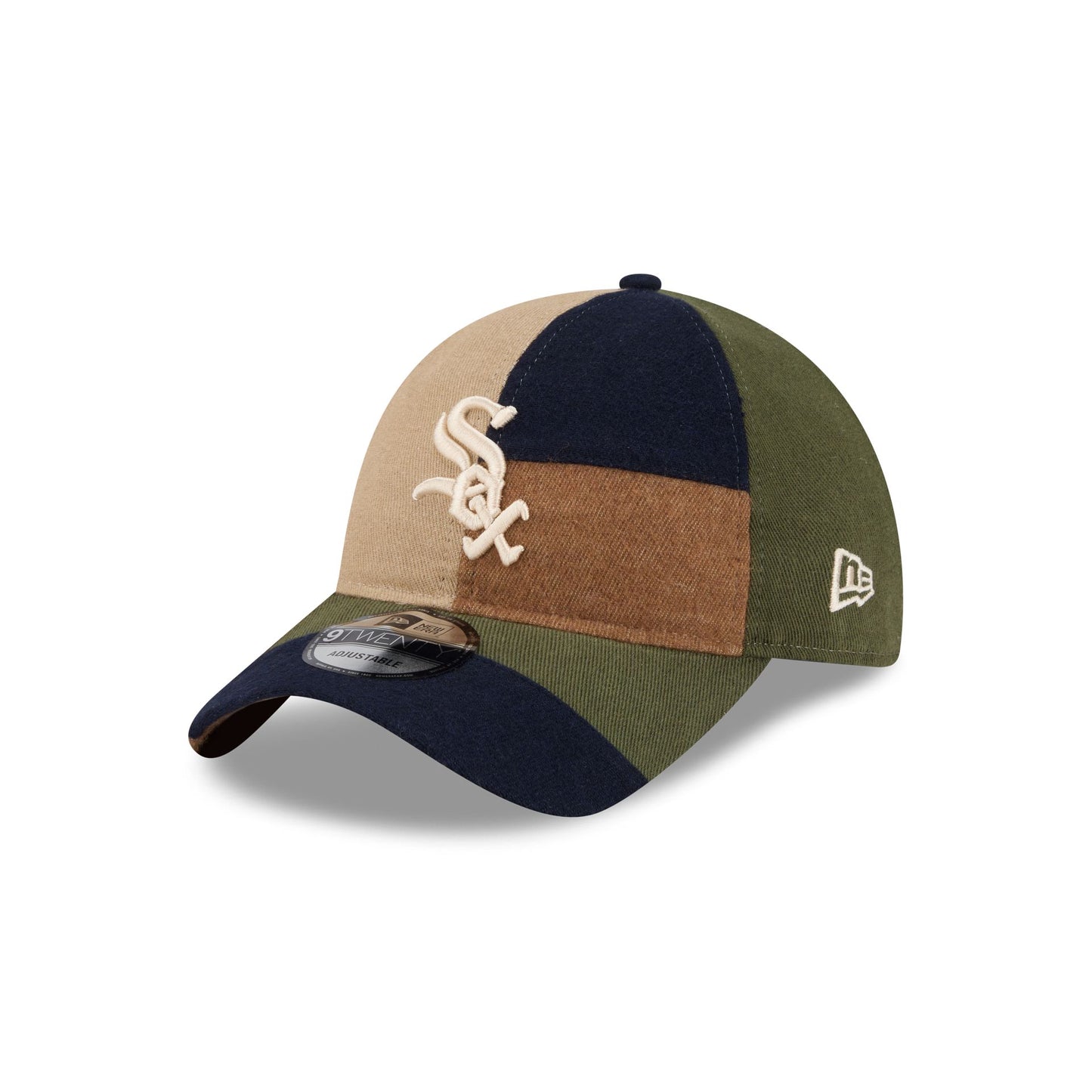 The Chicago White Sox Three Looms Cotton Twill Patchwork 9TWENTY Adjustable Cap features an embroidered White Sox logo at the front panels with a multi-colored patch fabrication, an adjustable buckle closure at the rear, and a brown undervisor.
