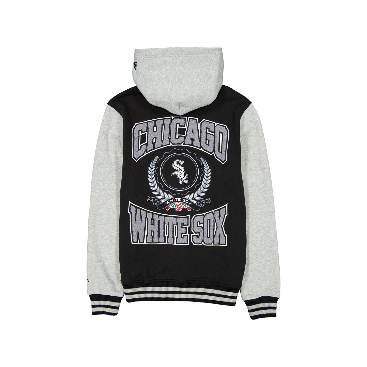 The Chicago White Sox Throwback Prep Jacket features a chain-stitched White Sox script at the right chest with a chenille applique team logo at the left chest. Additional details include a snap front closure with a chenille applique wordmark and team emblem at the rear.
