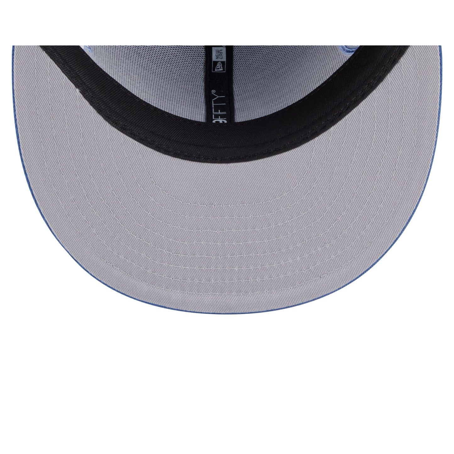 The Chivas Indigo 59FIFTY Fitted Cap features the Chivas primary logo embroidered at the front panels with alternate team logos throughout the crown, a team wordmark at the rear, and a gray undervisor.