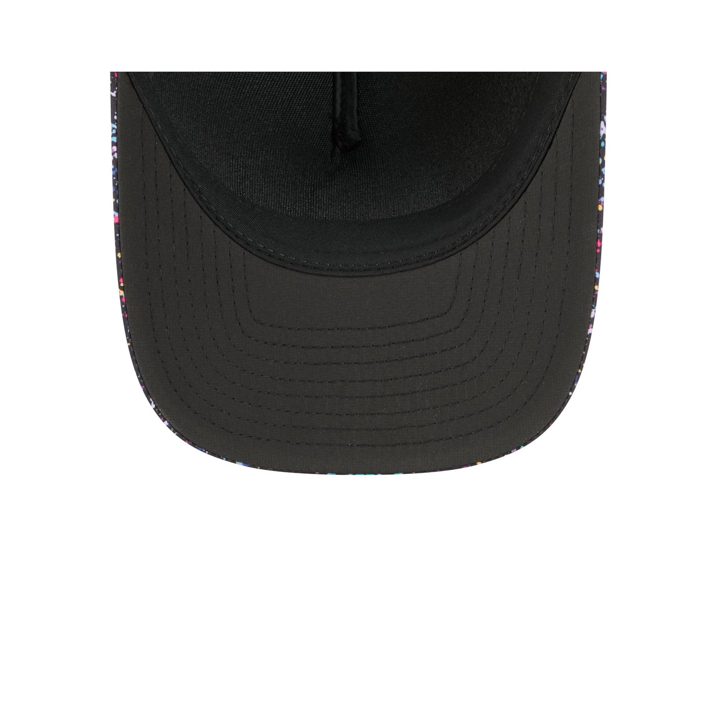 The Cincinnati Bengals 2025 Crucial Catch 9FORTY M-Crown A-Frame Trucker features an embroidered Bengals logo at the front paint splatter panels with a woven NFL Shield tag above a snapback closure at the rear. Additional details include a Crucial Catch Intercept Cancer patch at the right-wear side with performance mesh rear panels and a black undervisor.