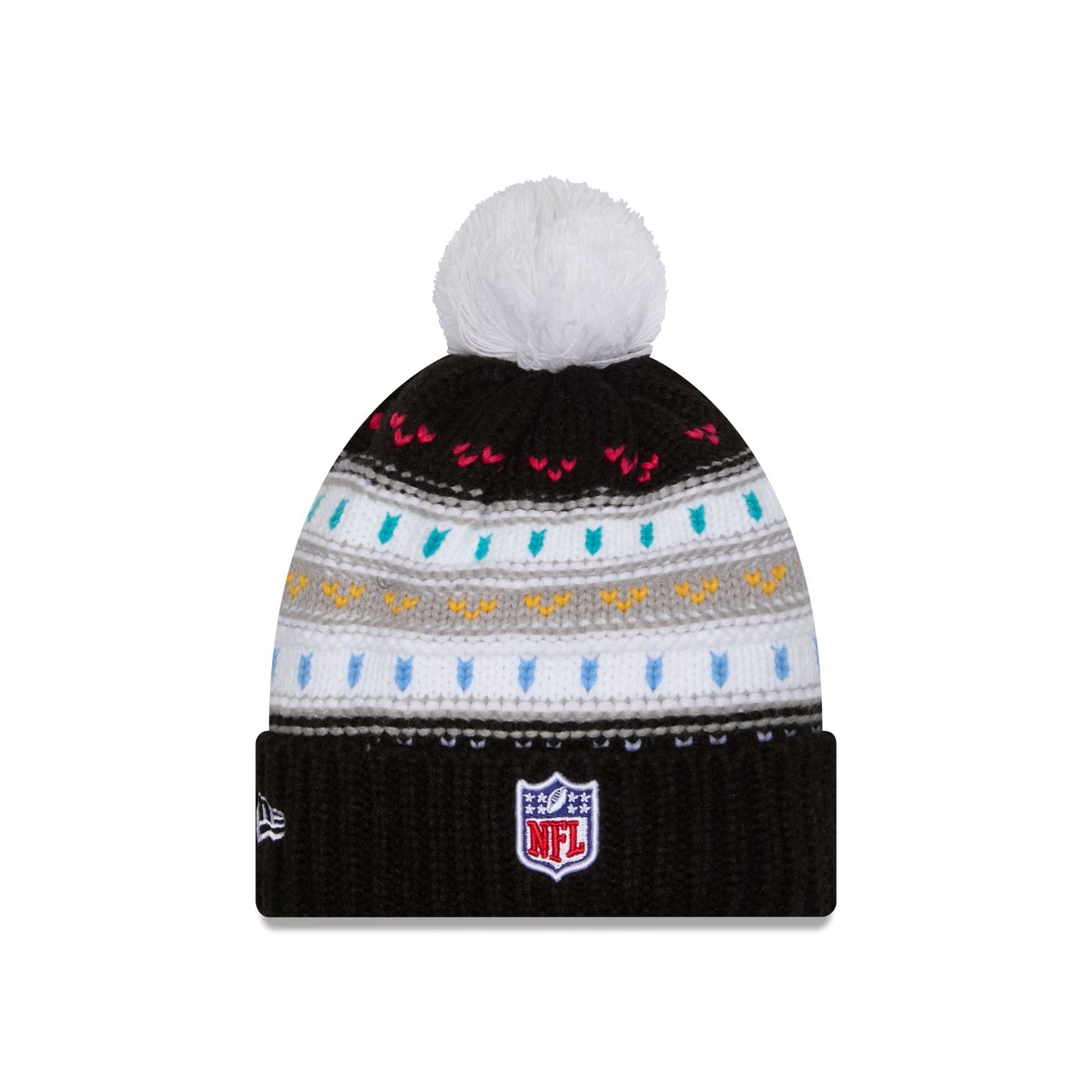 The Cincinnati Bengals 2025 Crucial Catch Women's Pom Knit features an embroidered Bengals logo at the front with an NFL Shield at the rear, a Crucial Catch Intercept Cancer patch at the right-wear side, and a one-time removeable pom.
