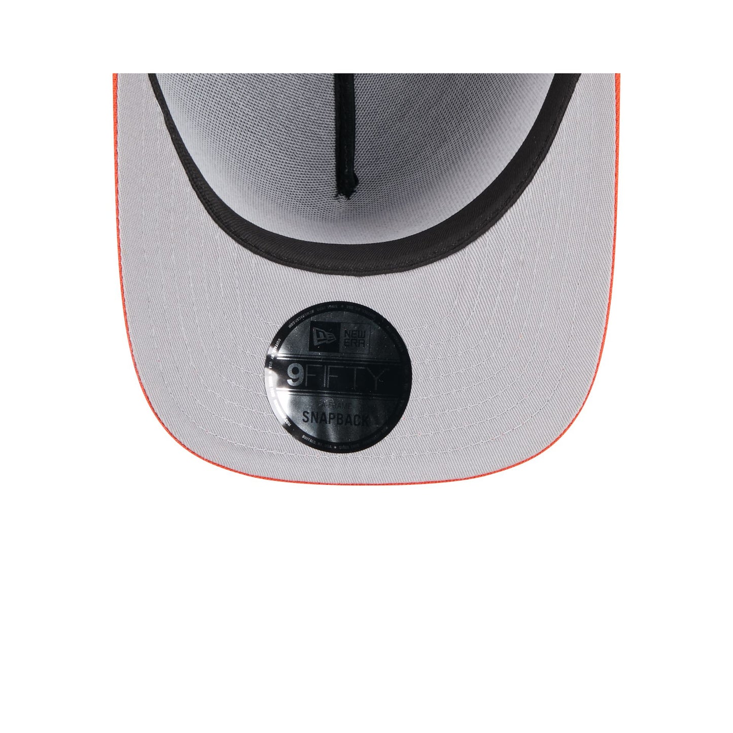 The Cincinnati Bengals 2025 Draft 9FIFTY A-Frame Snapback features an embroidered Bengals logo and wordmark at the front panels with an NFL Shield logo above a snapback closure at the rear. Additional details include ornamental stitched details at the visor and a gray undervisor.