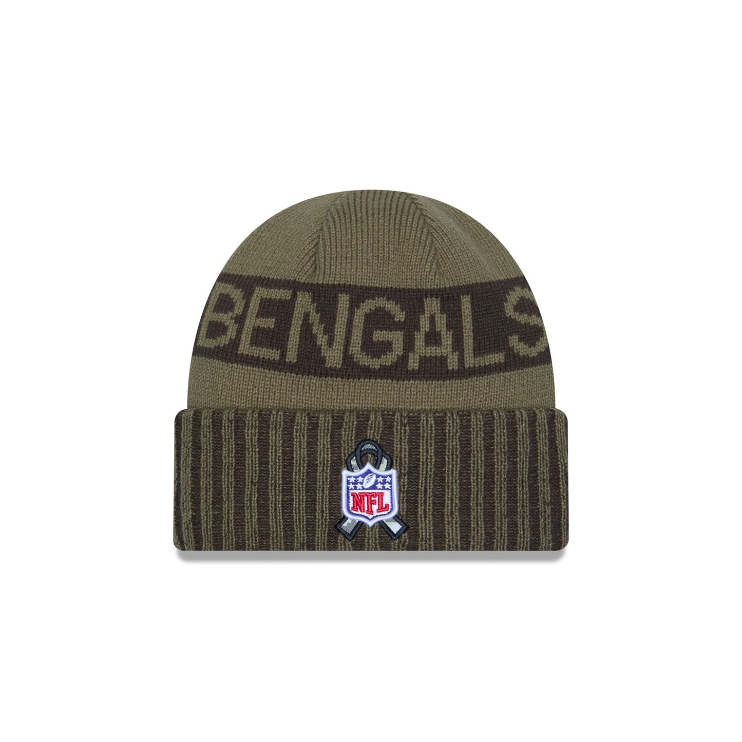 The Cincinnati Bengals 2025 Salute to Service Cuff Knit features an embroidered Bengals logo at the front with a team wordmark at the crown, an American flag patch at the right-wear side, and the official NFL Salute to Service patch at the rear.