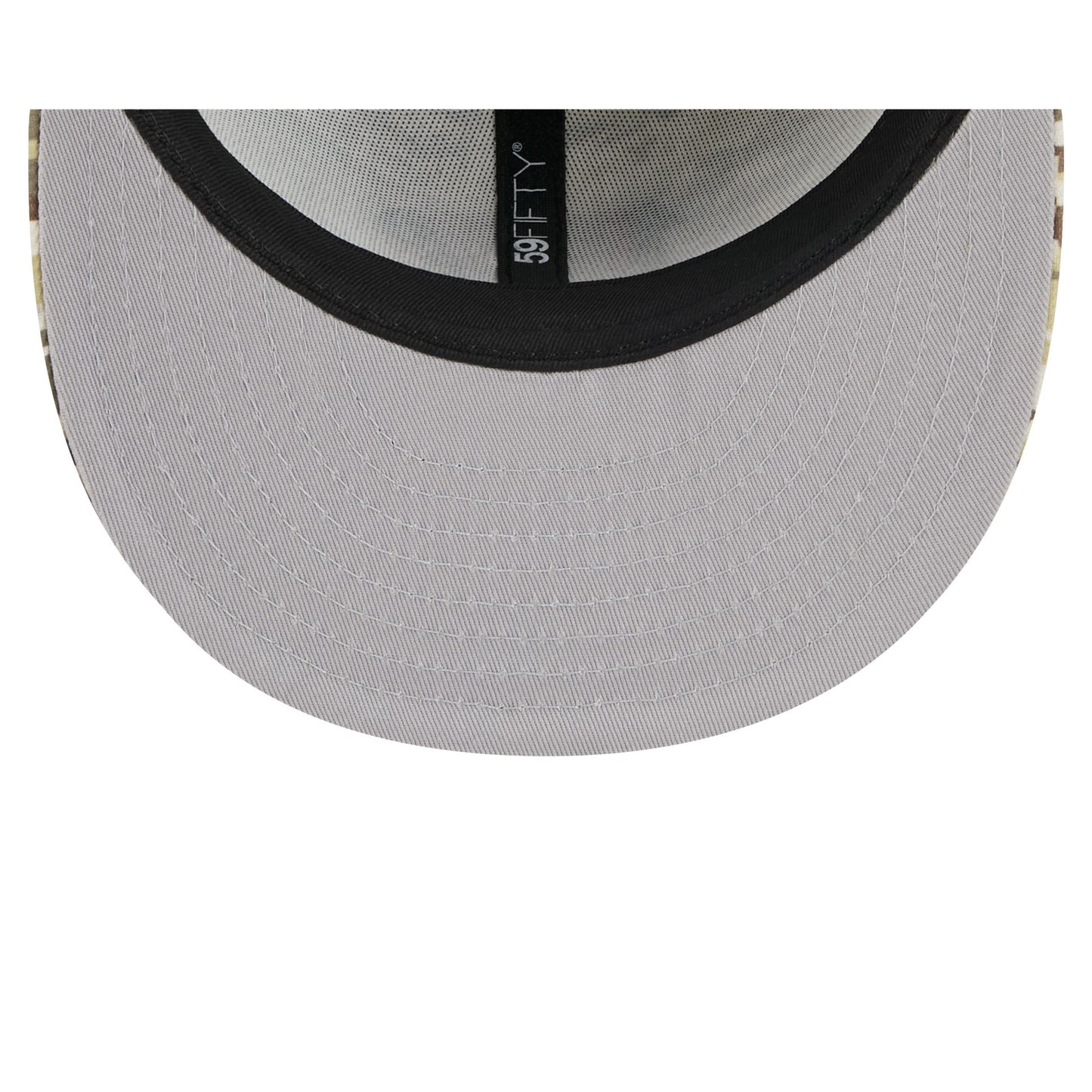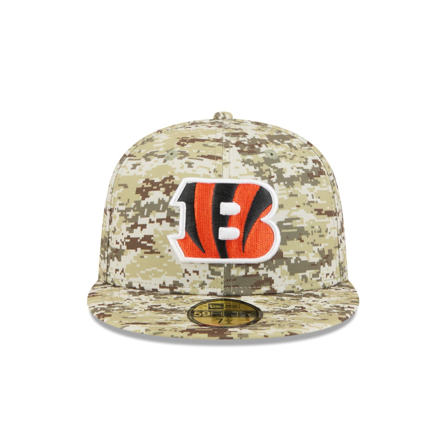 The Cincinnati Bengals 2025 Salute to Service Fan Gear 59FIFTY Fitted Cap features an embroidered Bengals logo at the front panels with the official NFL Salute to Service patch at the rear, an American flag patch at the right-wear side, and a gray undervisor.