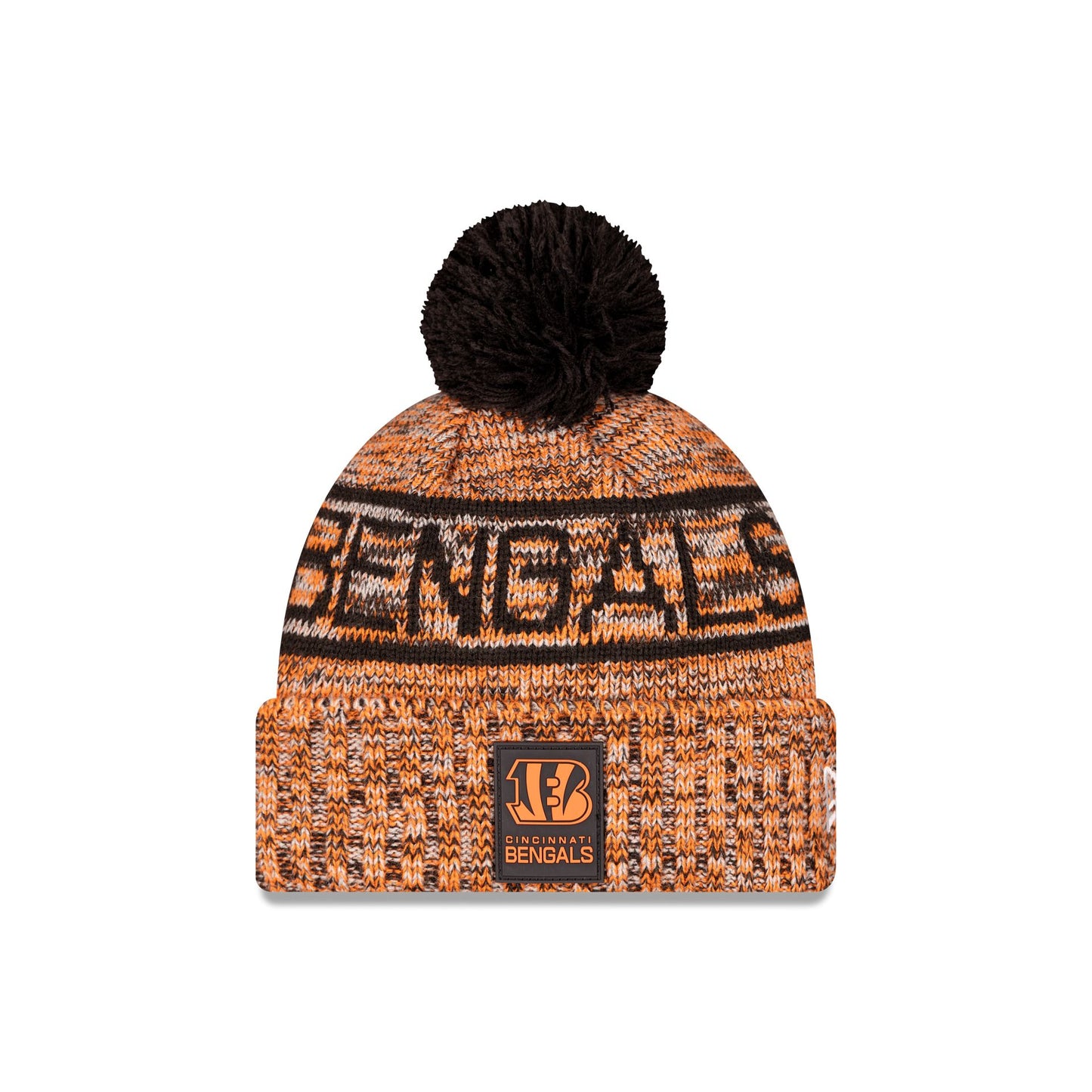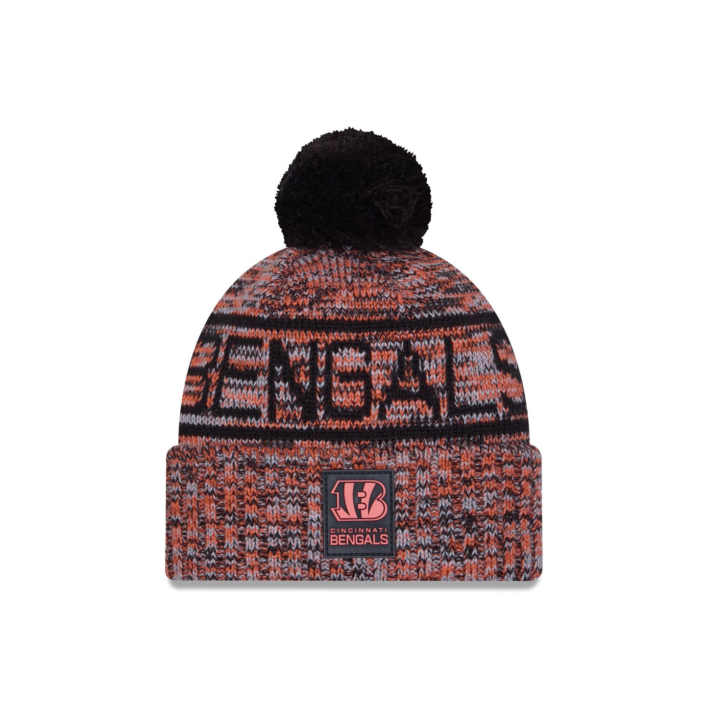 The Cincinnati Bengals 2025 Sideline Cold Weather Pom Knit Hat features a sewn-down silicone Bengals logo patch at the front cuff with a matching Official NFL Shield logo at the rear. Additional details include a team wordmark across the crown, a one-time removeable pom, and a fleece lining.