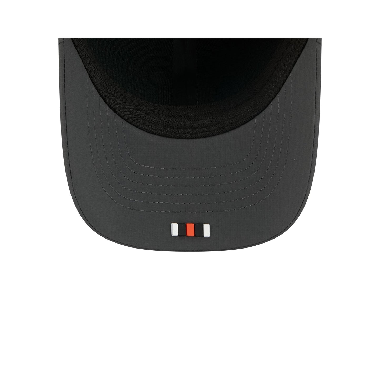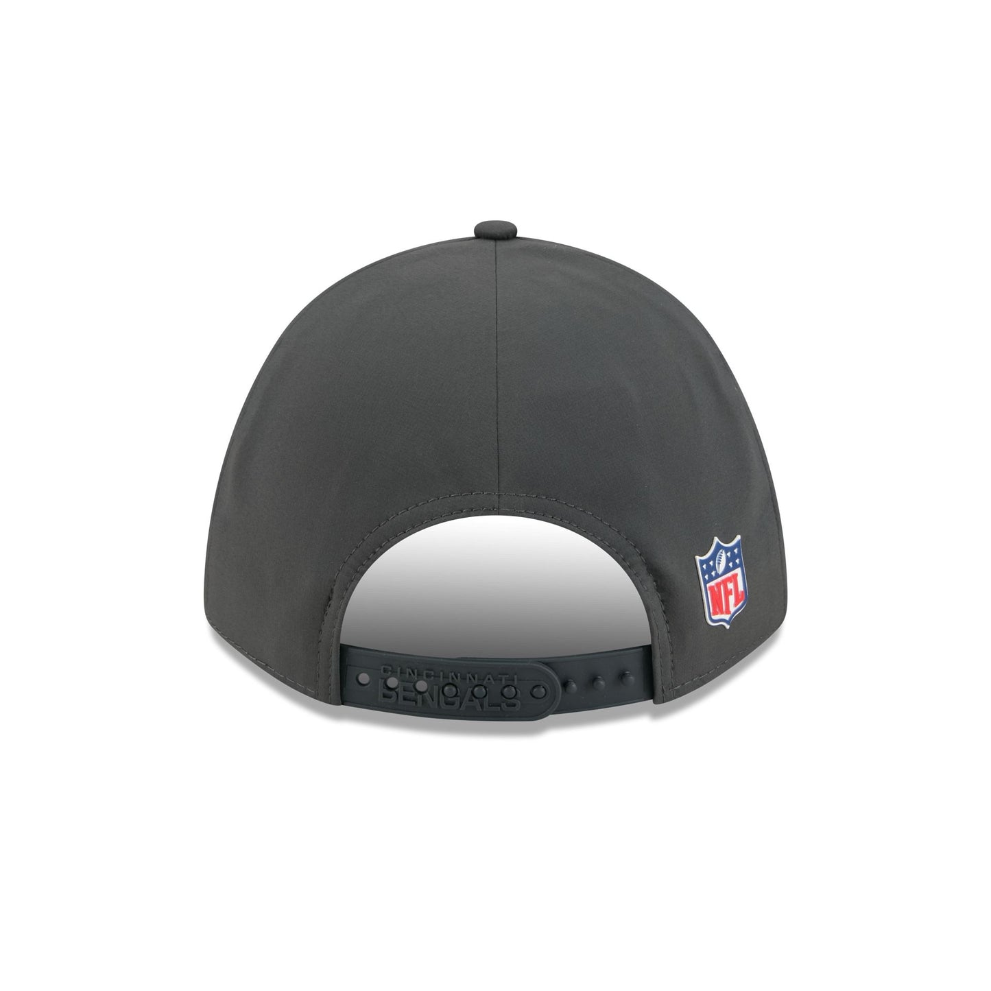 The Cincinnati Bengals 2025 Sideline Cold Weather Steel Clouds 9FORTY M-Crown Snapback features a sewn-down silicone Bengals logo patch at the front panels with a water-repellent quill tech fabrication throughout and a quick-dry cushioned sweatband to absorb moisture. Additional details include the Official NFL Shield logo to the right of a soft silicone snapback closure at the rear. The crown has bonded seams to trap warmth and the undervisor is accented with a silicone transfer in the team’s colors.