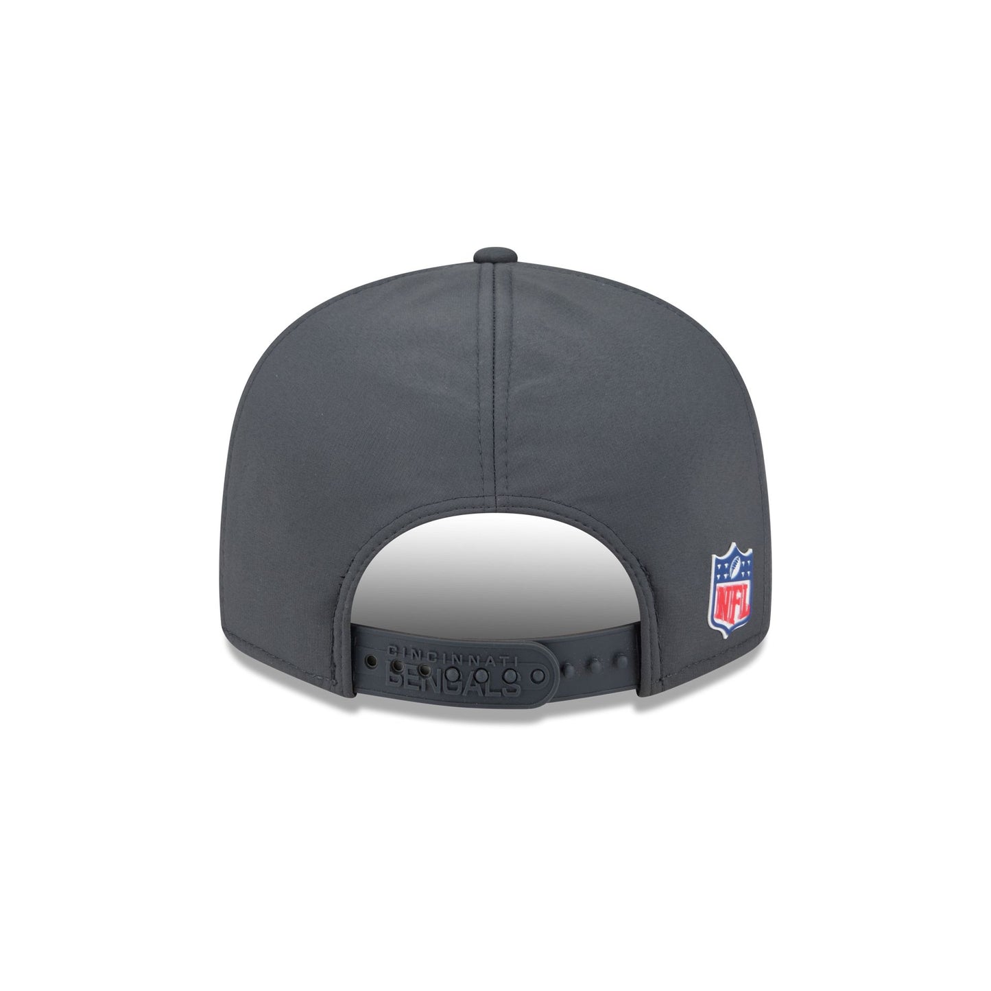 The Cincinnati Bengals 2025 Sideline Cold Weather Steel Clouds Split Panel 9FIFTY Snapback features a sewn-down silicone Bengals logo patch at the front panels with a split-crown construction and diamond quilting. The cap has a water-repellent quill tech fabrication throughout, with a quick-dry cushioned sweatband to absorb moisture. Additional details include the Official NFL Shield logo to the right of a soft silicone snapback closure at the rear with eyelets at each side panel. The undervisor is accented with a silicone transfer in the team’s colors.