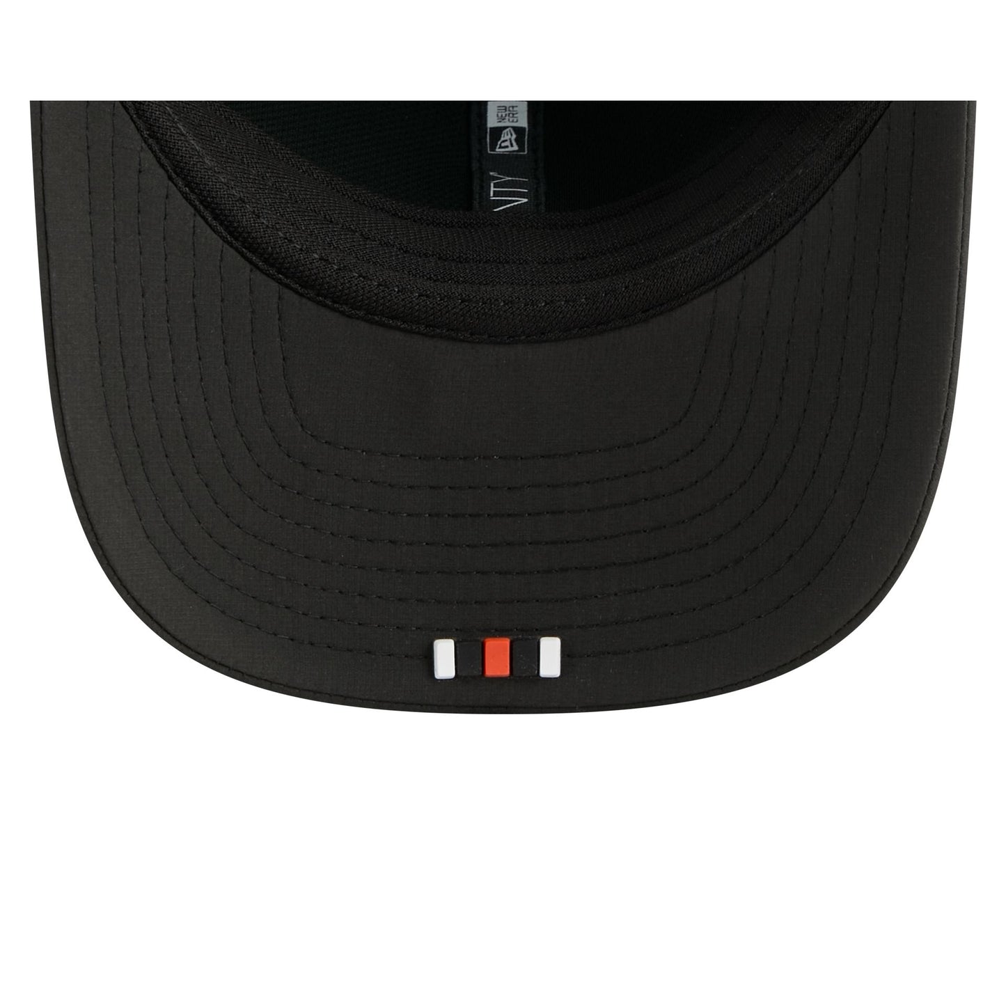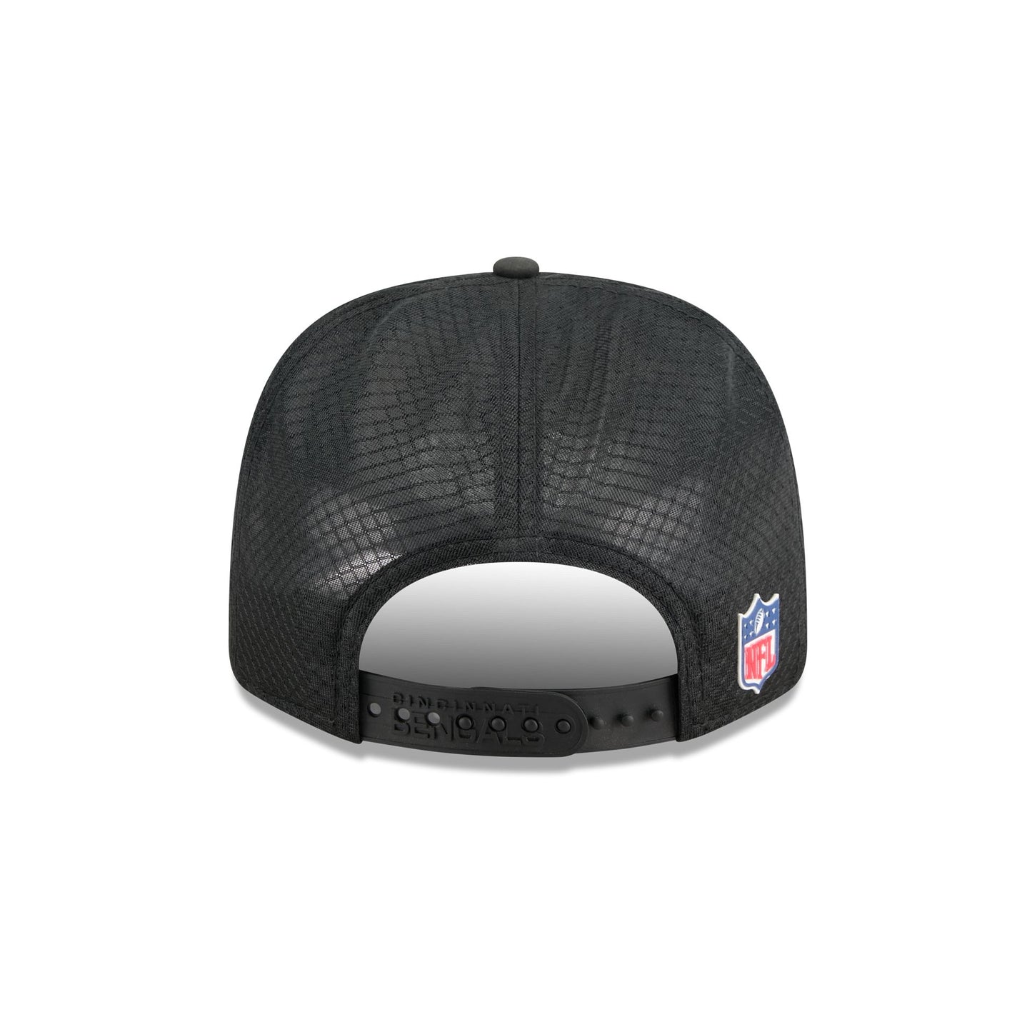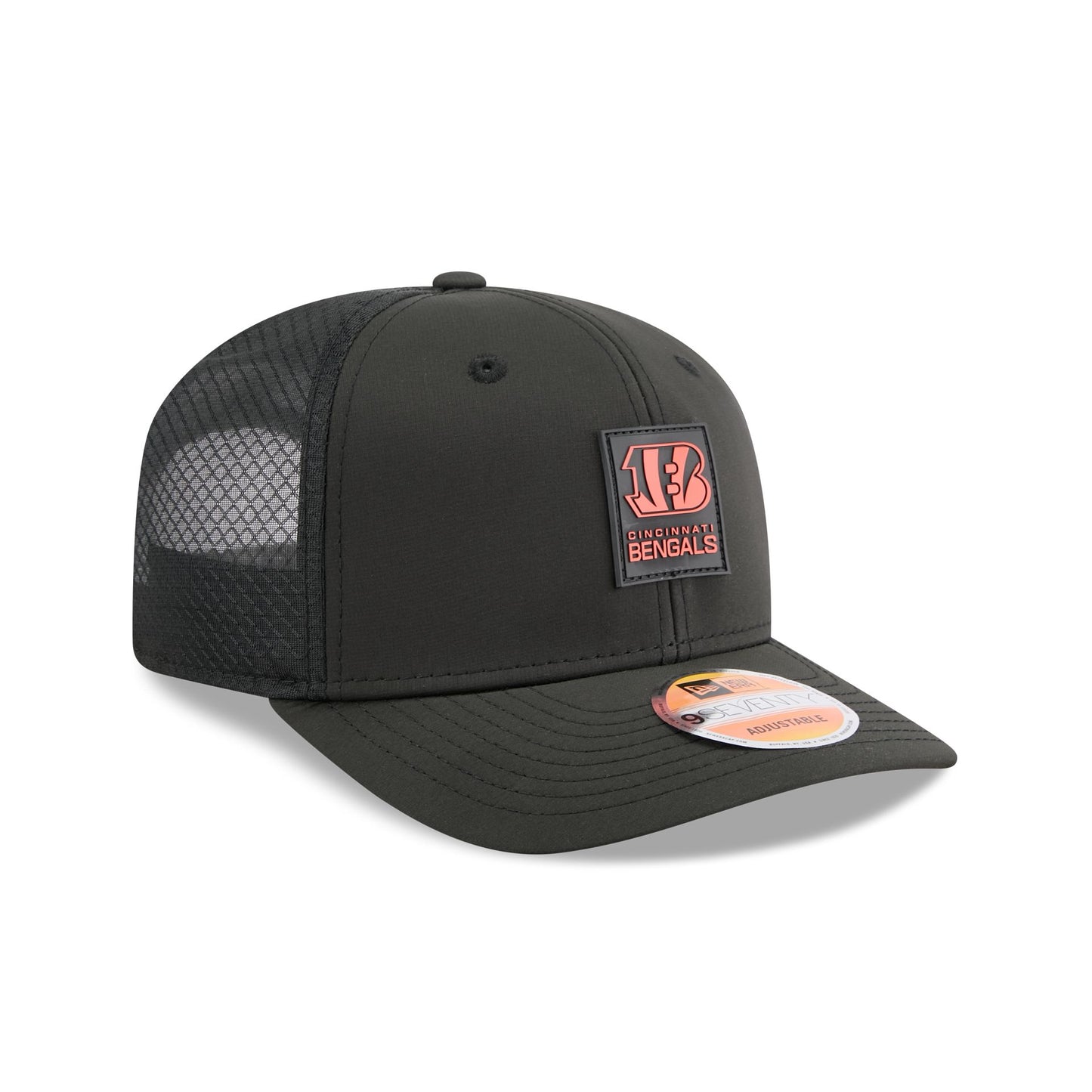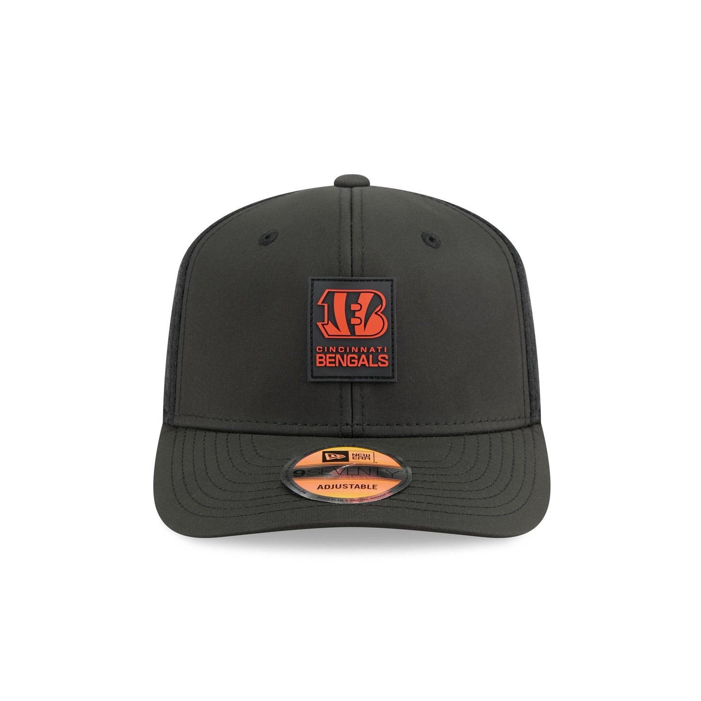 The Cincinnati Bengals 2025 Sideline Hot Weather 9SEVENTY Trucker features a sewn-down silicone Bengals logo patch at the front panels with a water-repellent quill tech fabrication throughout and a quick-dry cushioned sweatband to absorb moisture. Additional details include the Official NFL Shield logo to the right of a soft silicone snapback closure at a light-weight mesh rear. The undervisor is accented with a silicone transfer in the team’s colors.