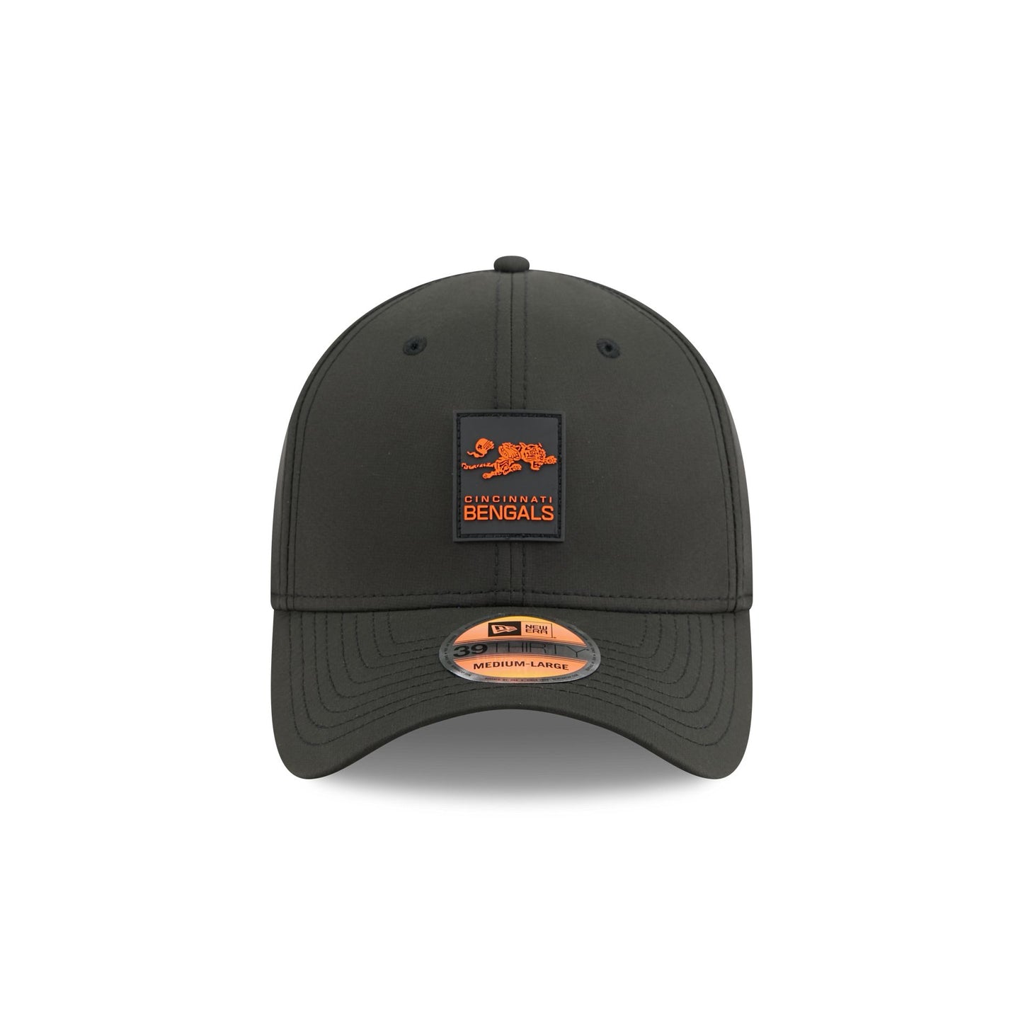 The Cincinnati Bengals 2025 Sideline Hot Weather Historic 39THIRTY Stretch Fit features a sewn-down silicone Bengals historic logo patch at the front panels with the Official NFL Shield logo at the rear. The cap has a water-repellent quill tech fabrication throughout, with an insulated crown and quick-dry cushioned sweatband. The undervisor is accented with a silicone transfer in the team’s colors.