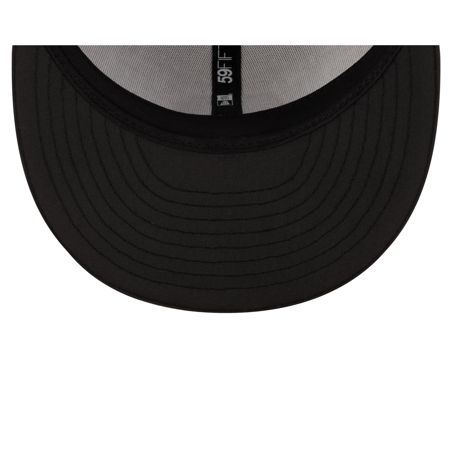 The Cincinnati Bengals 2025 Training 59FIFTY Fitted Cap features a silicone Bengals patch at the front panels with team color stripes at the front of a black visor and a silicone NFL Shield patch at the rear.