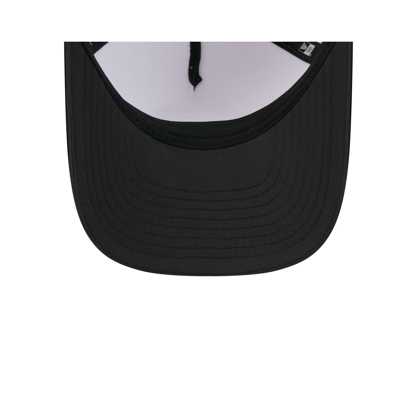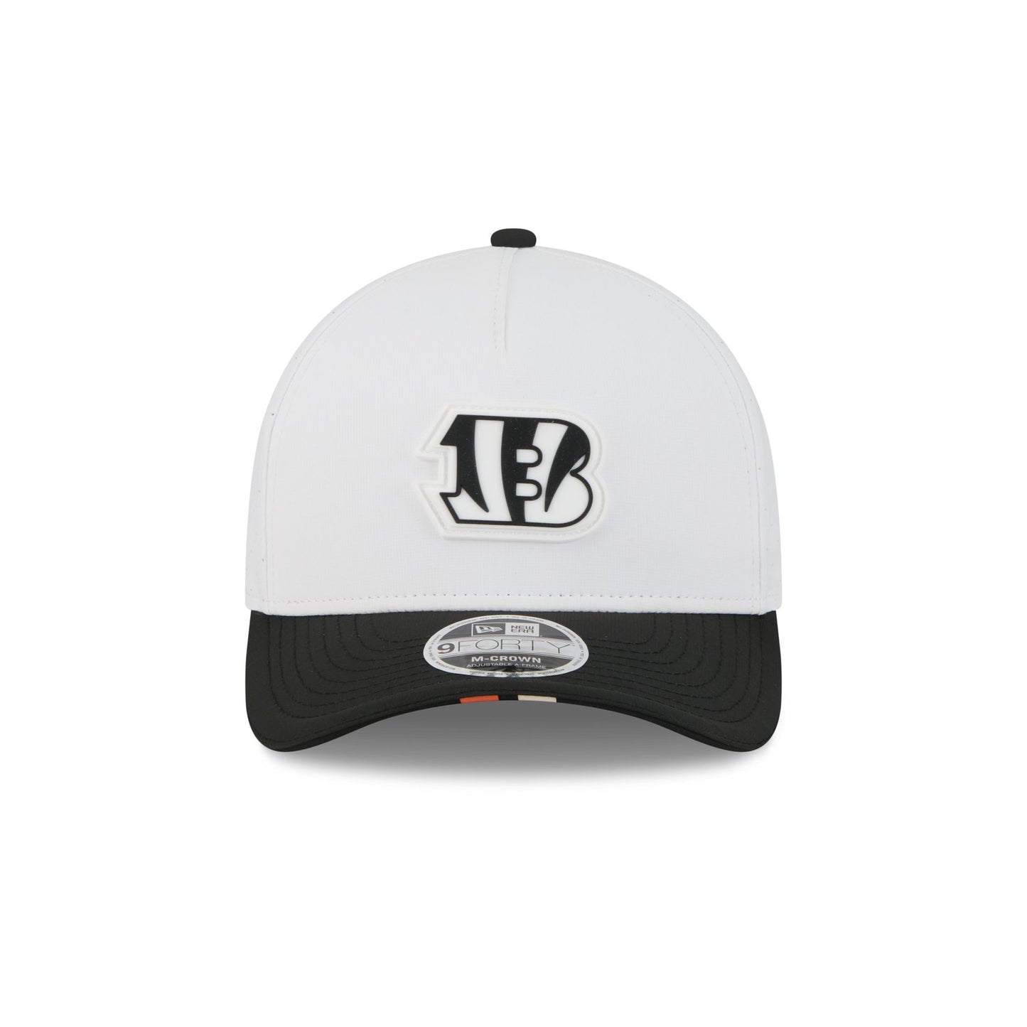 The Cincinnati Bengals 2025 Training 9FORTY M-Crown A-Frame Snapback features a silicone Bengals patch at the front panel with team color stripes at the front of a black visor. Additional details include a silicone NFL Shield patch on a woven foldover tab above a snapback closure at the rear.