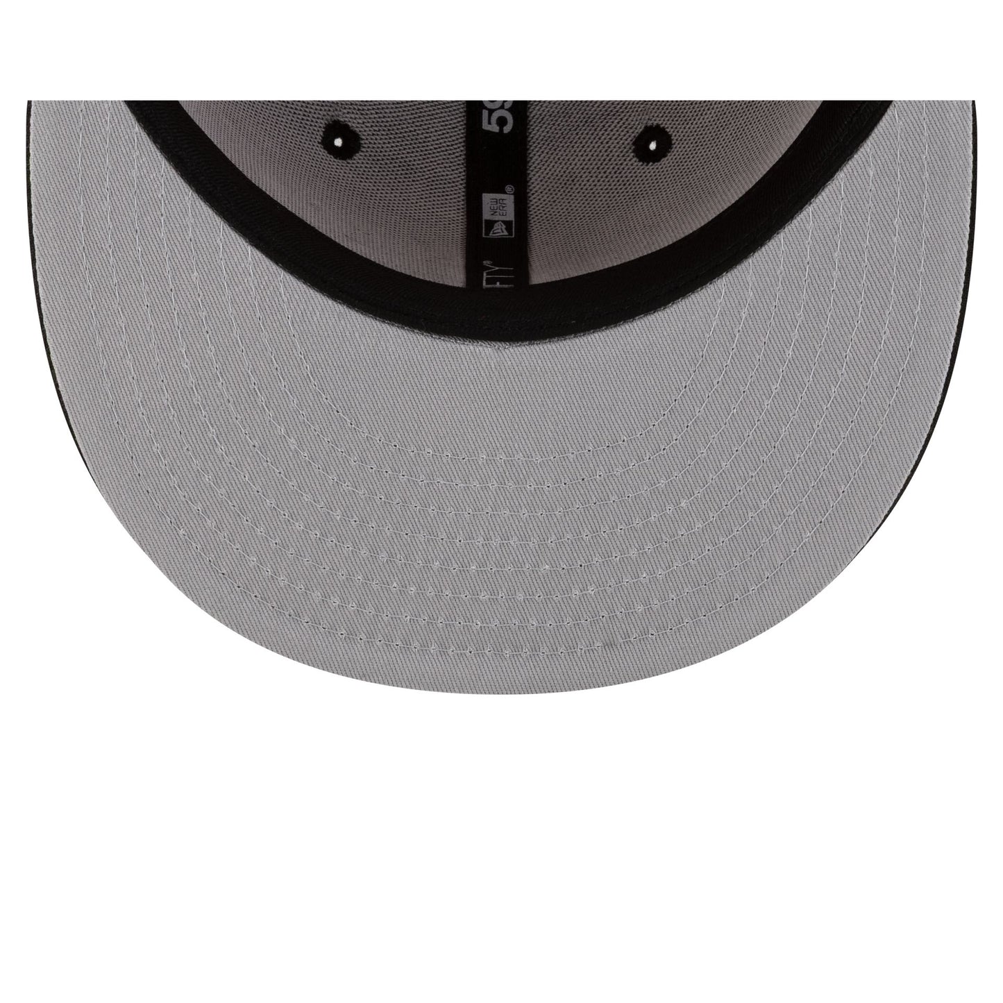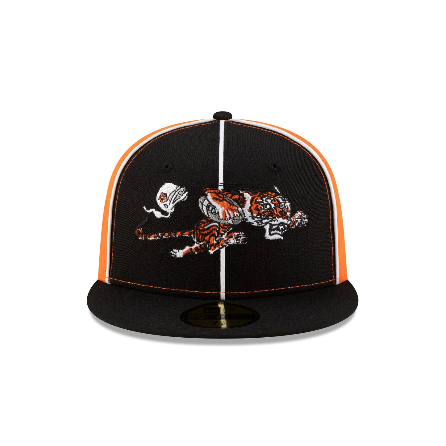 The Cincinnati Bengals Two-Tone Pinwheel 59FIFTY Fitted Cap features an embroidered Bengals Historic logo at the front panels with a matching team wordmark at the rear. Additional details include a black and orange paneled crown with a 25th Anniversary patch at the right-wear side and a gray undervisor.