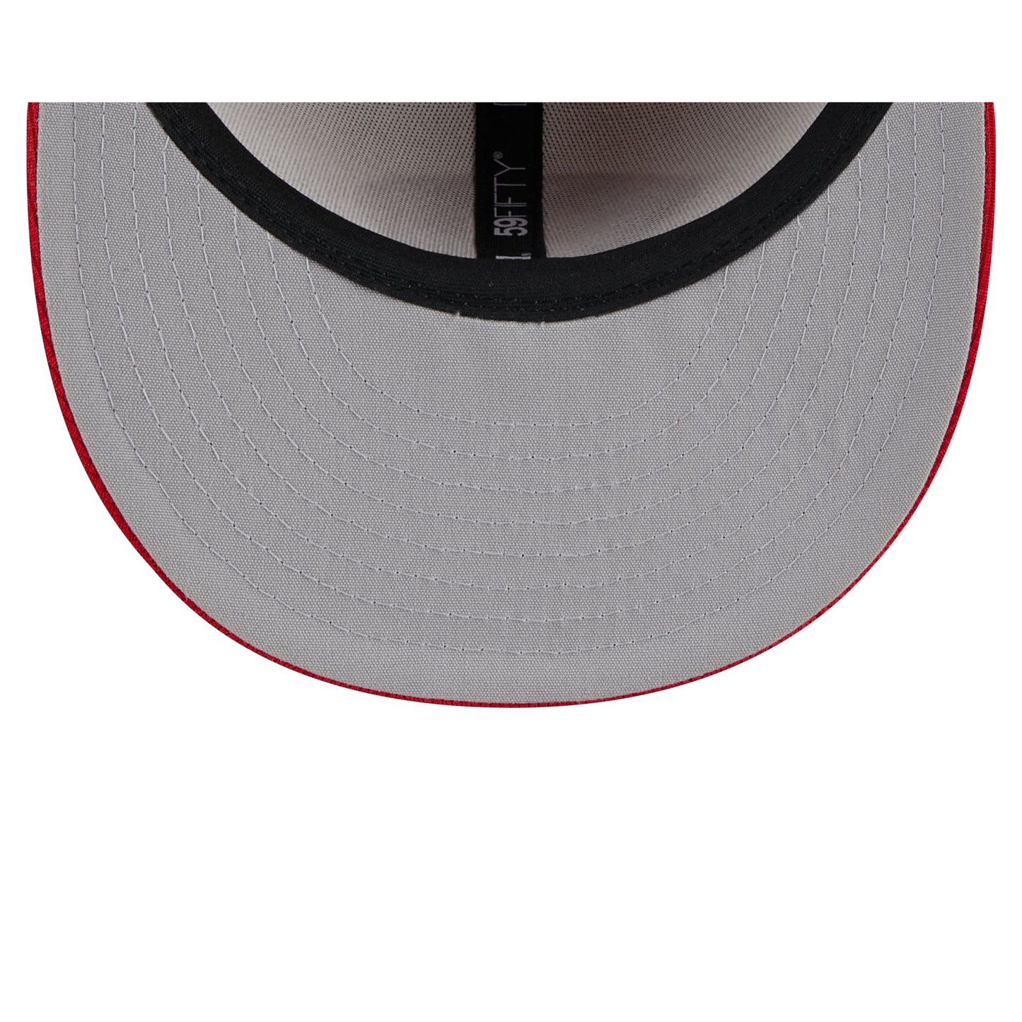 The Cincinnati Reds 2025 Batting Practice 59FIFTY Fitted Cap features an embroidered Reds logo at the front panels with a matching MLB Batterman logo at the rear. Additional details include a pivot knit fabrication, a red visor, and a gray undervisor.