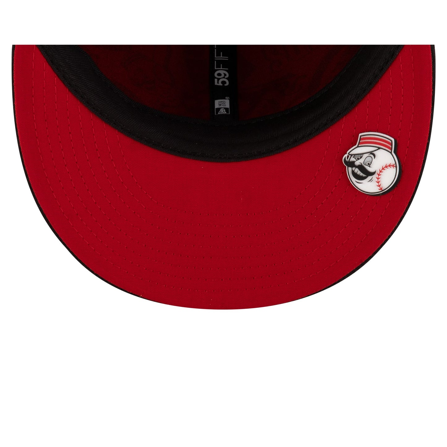 The Cincinnati Reds 2025 Clubhouse Black 59FIFTY Fitted Cap features an embroidered Reds logo at the front panels with a matching MLB Batterman logo at the rear and a dashmark mesh fabrication throughout. Additional details include a silicone logo on the undervisor and a team design on the inner lining.