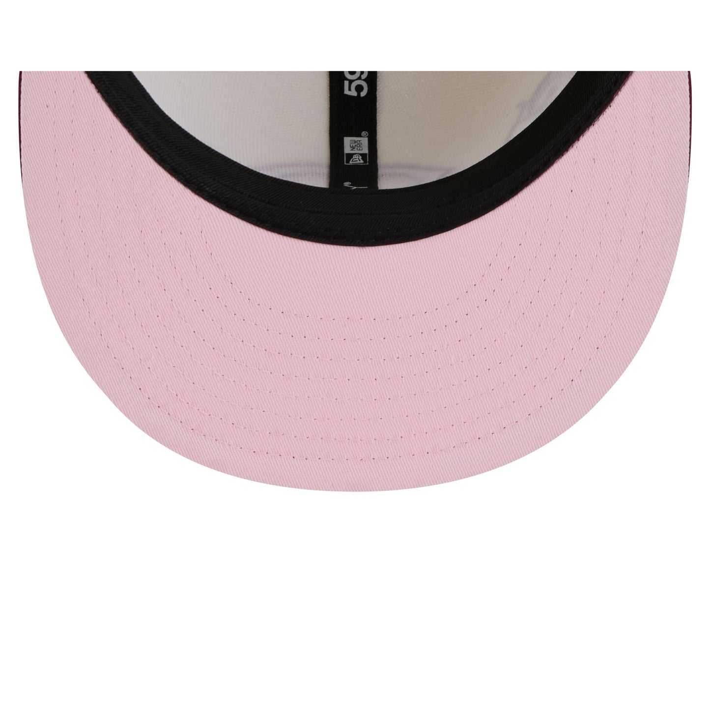 The Cincinnati Reds Cherub 59FIFTY Fitted Cap features an embroidered Reds logo and cherub angel at the front panels with a matching MLB Batterman logo at the rear and a pink undervisor.
