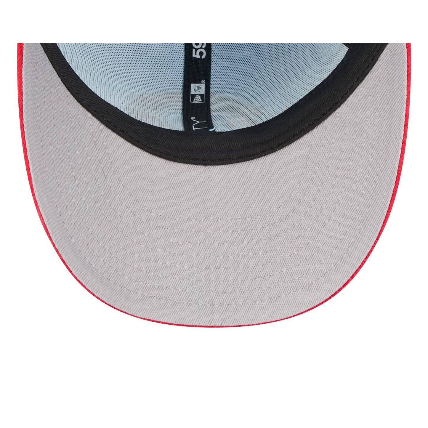 The Cincinnati Reds Independence Day 2025 Low Profile 59FIFTY Fitted Cap features an embroidered American flag themed Reds logo at the front panels with a matching MLB Batterman logo at the rear, a red visor, and a gray undervisor.
