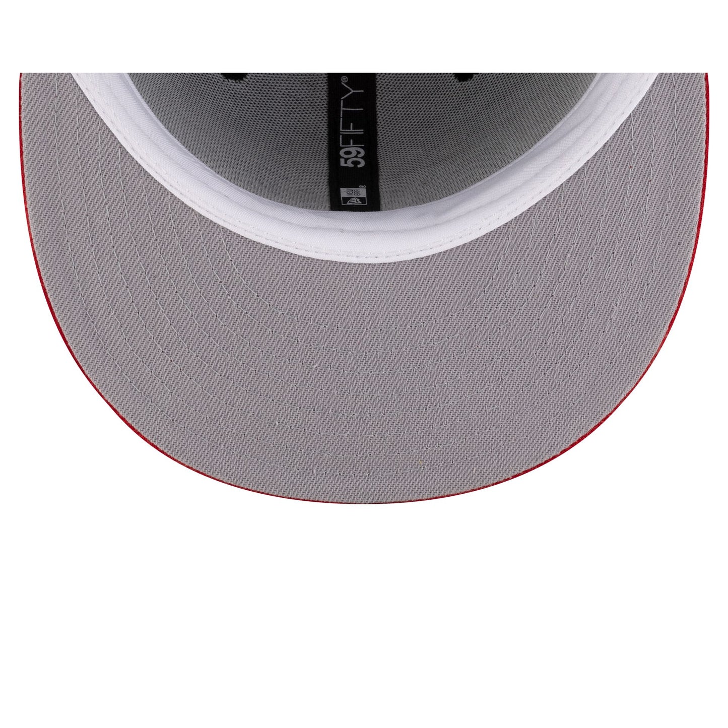 The Cincinnati Reds Mascot Black 59FIFTY Fitted Cap features an embroidered Reds mascot at the front panels with a matching MLB Batterman logo at the rear. Additional details include a World Champions Anniversaries patch at the right-wear side and a gray undervisor,