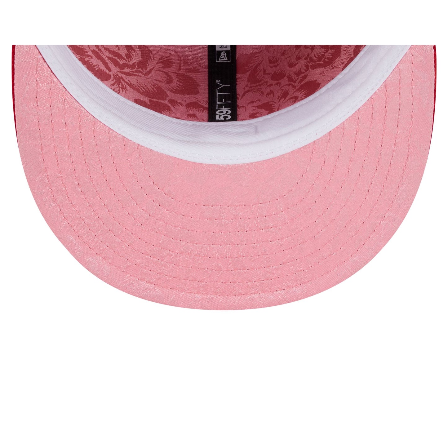 The Cincinnati Reds Floral Undervisor 59FIFTY Fitted Cap features an embroidered Reds logo at the front panels with a matching MLB Batterman logo at the rear. Additional details include a floral team patch at the right-wear side with a pink floral undervisor and lining.