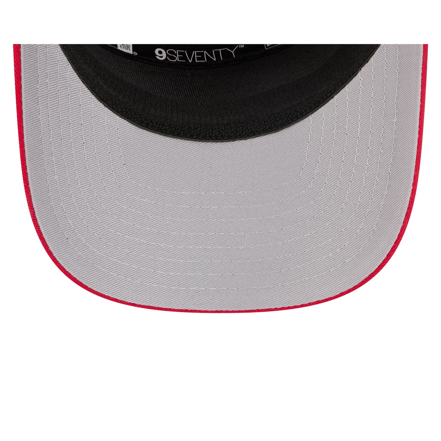 The Cincinnati Reds Split Panel 9SEVENTY Stretch-Snap features an embroidered Reds logo at the front panel with a split crown construction and a rope at the visor. Additional details include an adjustable stretch-snap closure at the rear and a gray undervisor.