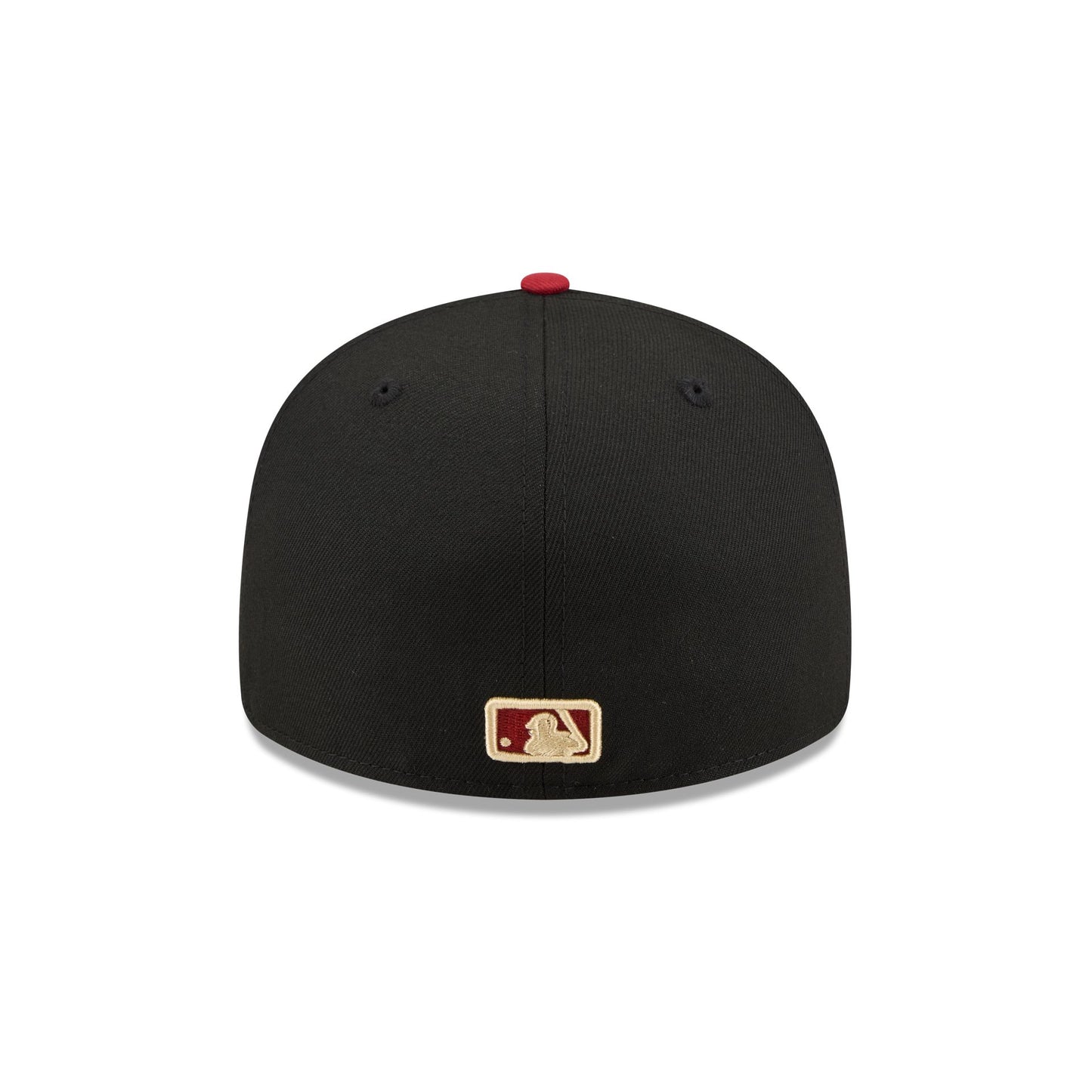 The Cincinnati Reds Team Cards 59FIFTY Fitted Cap features an embroidered Reds logo at the front panels with a team card patch with heart at the right-wear side. Additional details include the MLB Batterman logo at the rear and a green undervisor.