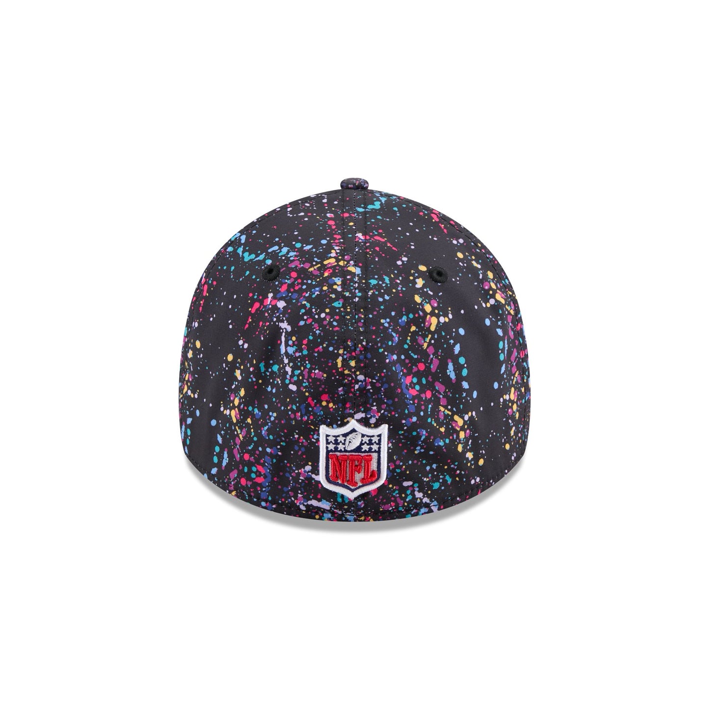 The Cleveland Browns 2025 Crucial Catch 39THIRTY Stretch Fit Cap features an embroidered Browns logo at the front paint splatter panels with an NFL Shield at the rear, a Crucial Catch Intercept Cancer patch at the right-wear side, and a black undervisor.