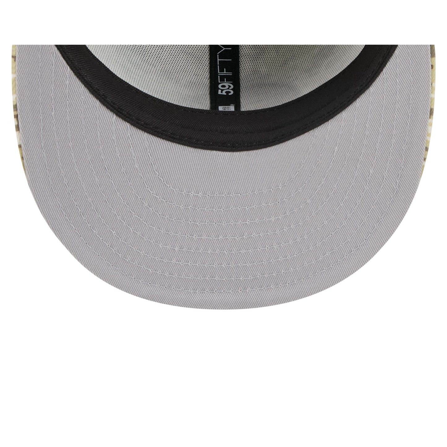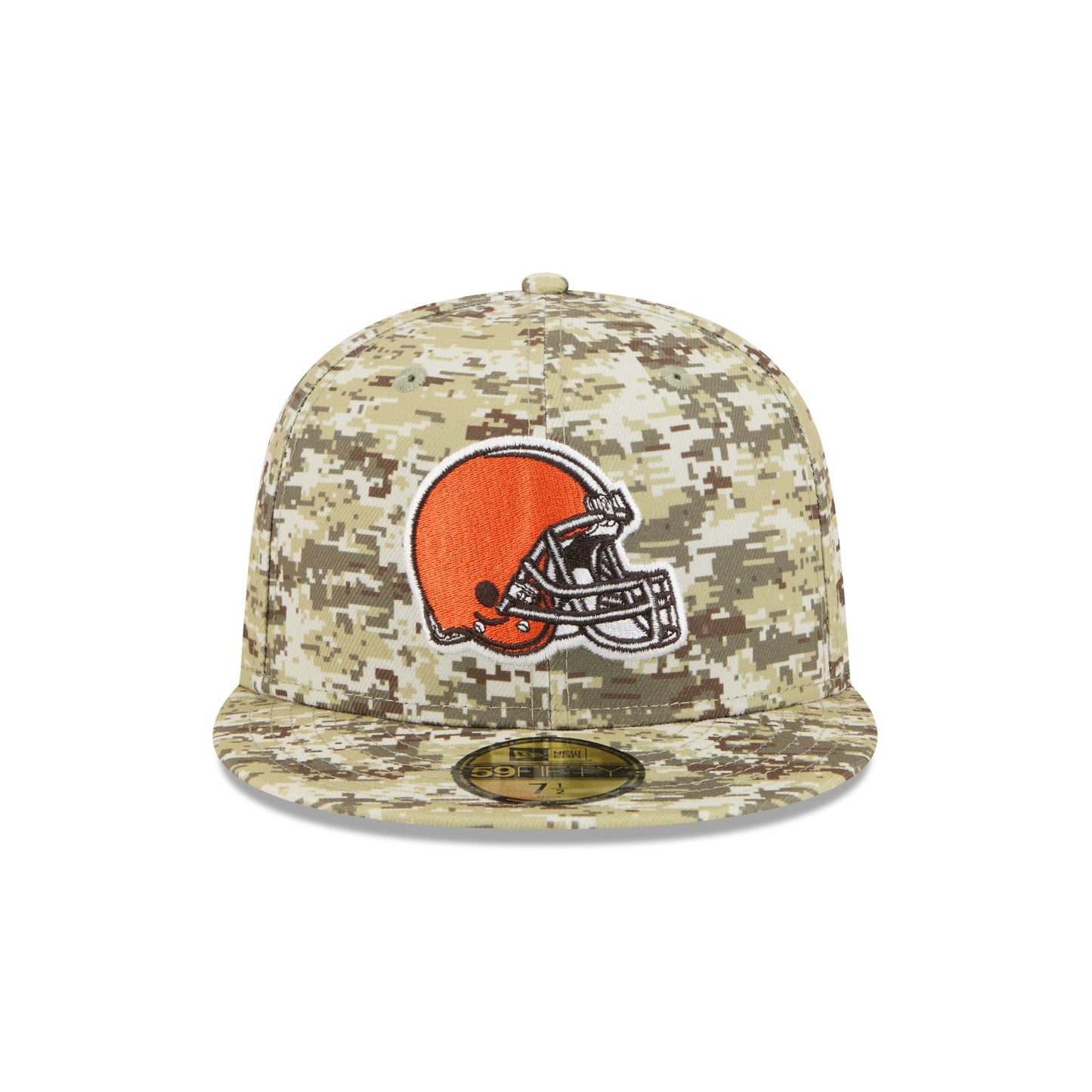 The Cleveland Browns 2025 Salute to Service Fan Gear 59FIFTY Fitted Cap features an embroidered Browns logo at the front panels with the official NFL Salute to Service patch at the rear, an American flag patch at the right-wear side, and a gray undervisor.