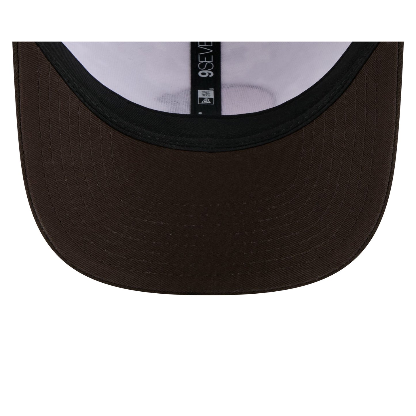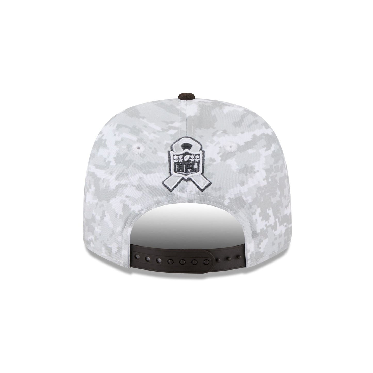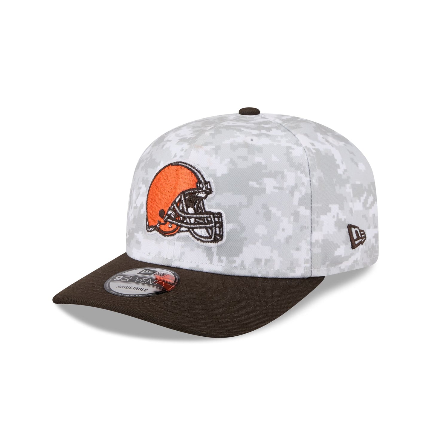 The Cleveland Browns 2025 Salute to Service Fan Gear 9SEVENTY Stretch-Snap Cap features an embroidered Browns logo at the front panels with the official NFL Salute to Service patch above a snapback closure at the rear, an American flag patch at the right-wear side, and a team color visor.