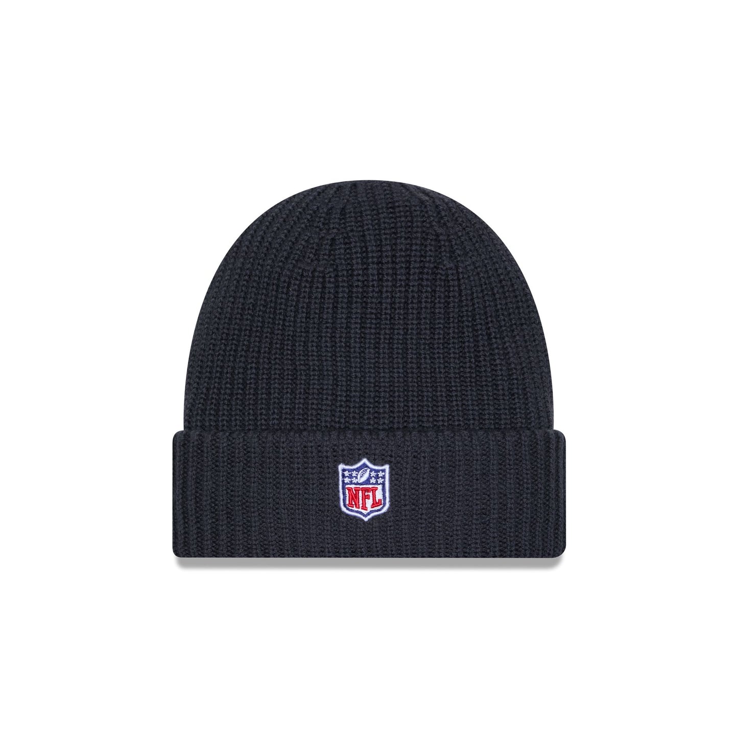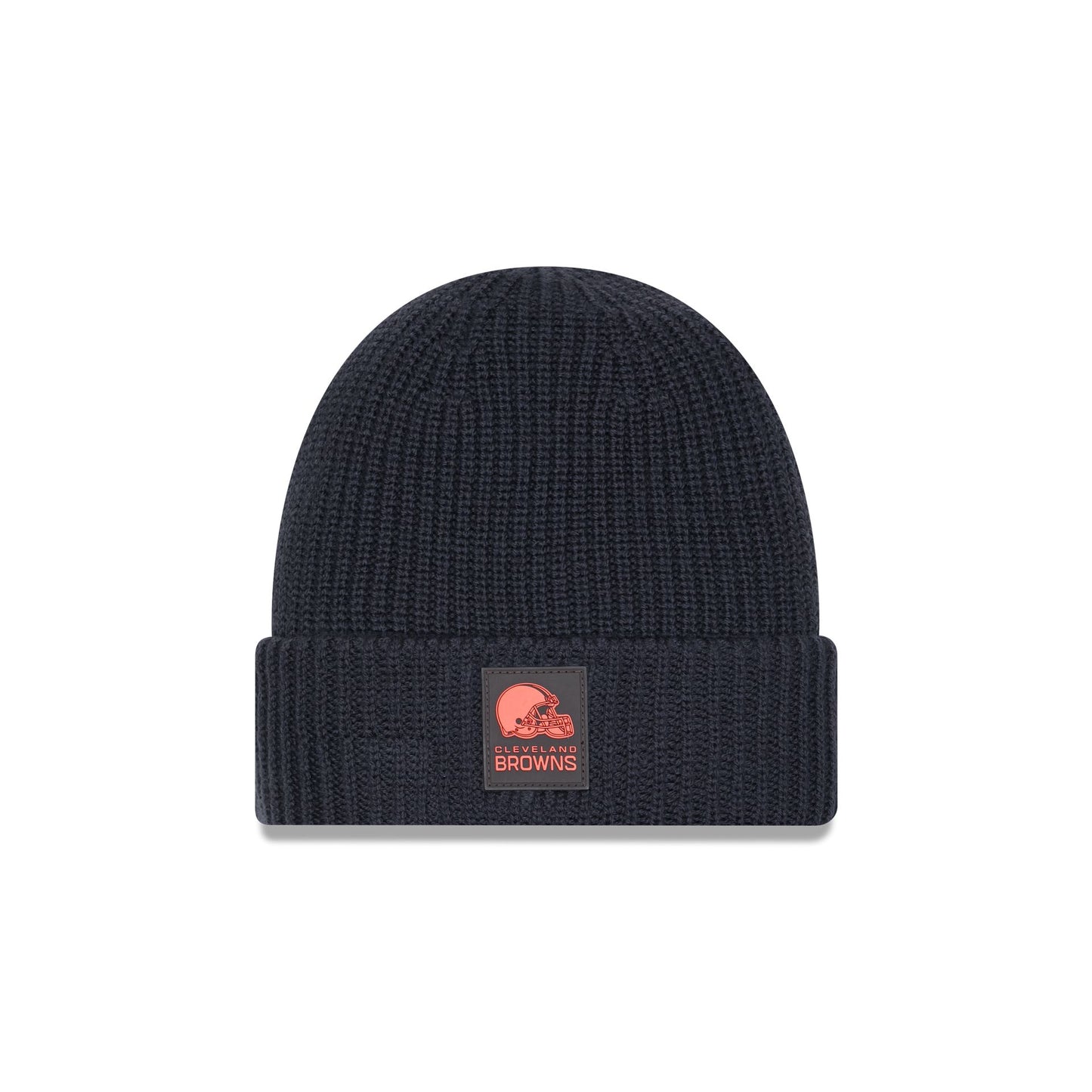 The Cleveland Browns 2025 Sideline Cold Weather Steel Clouds Cuff Knit Beanie features a sewn-down silicone Browns logo patch at the front cuff with a matching Official NFL Shield logo at the rear. The beanie is knit from wool yarn and lined with fleece.