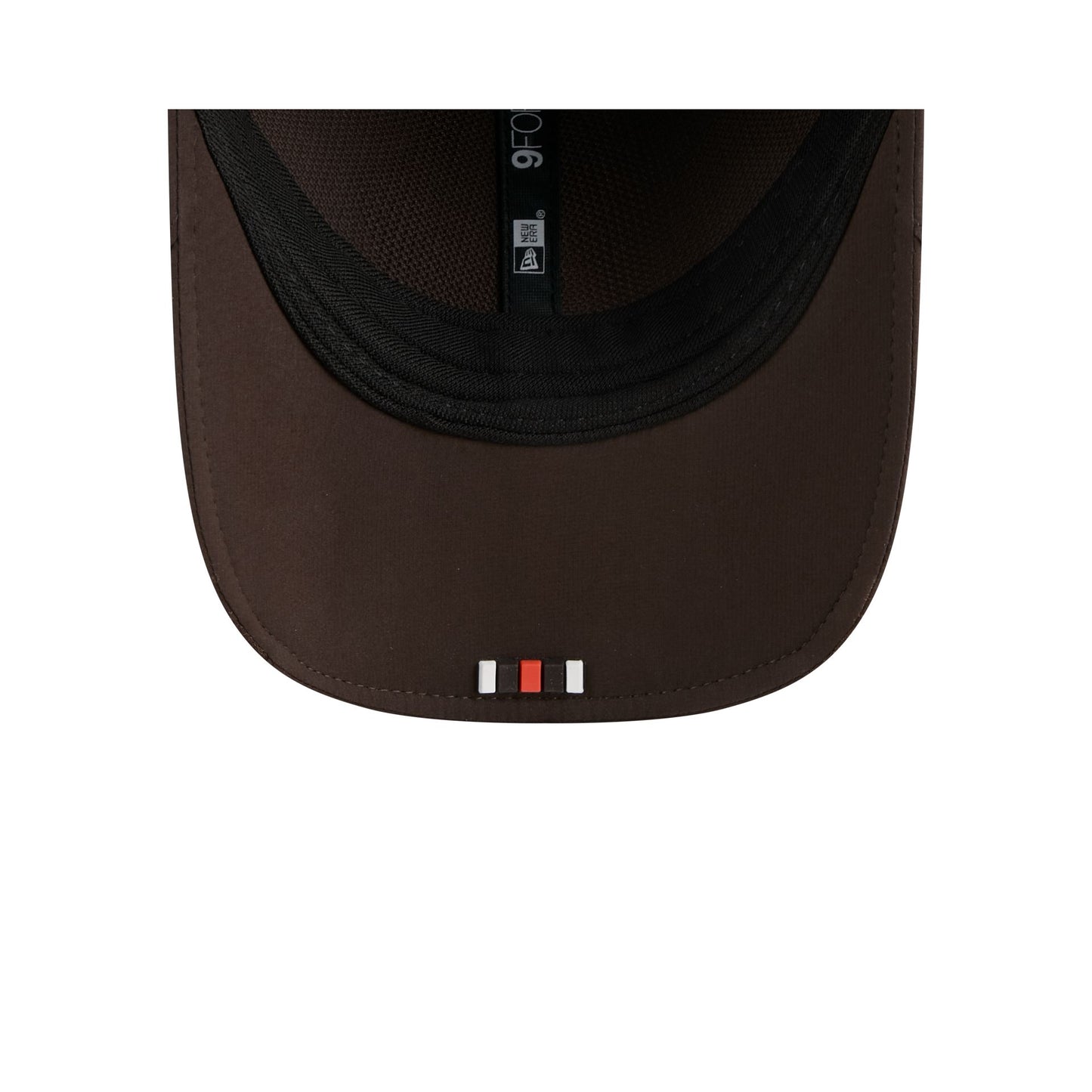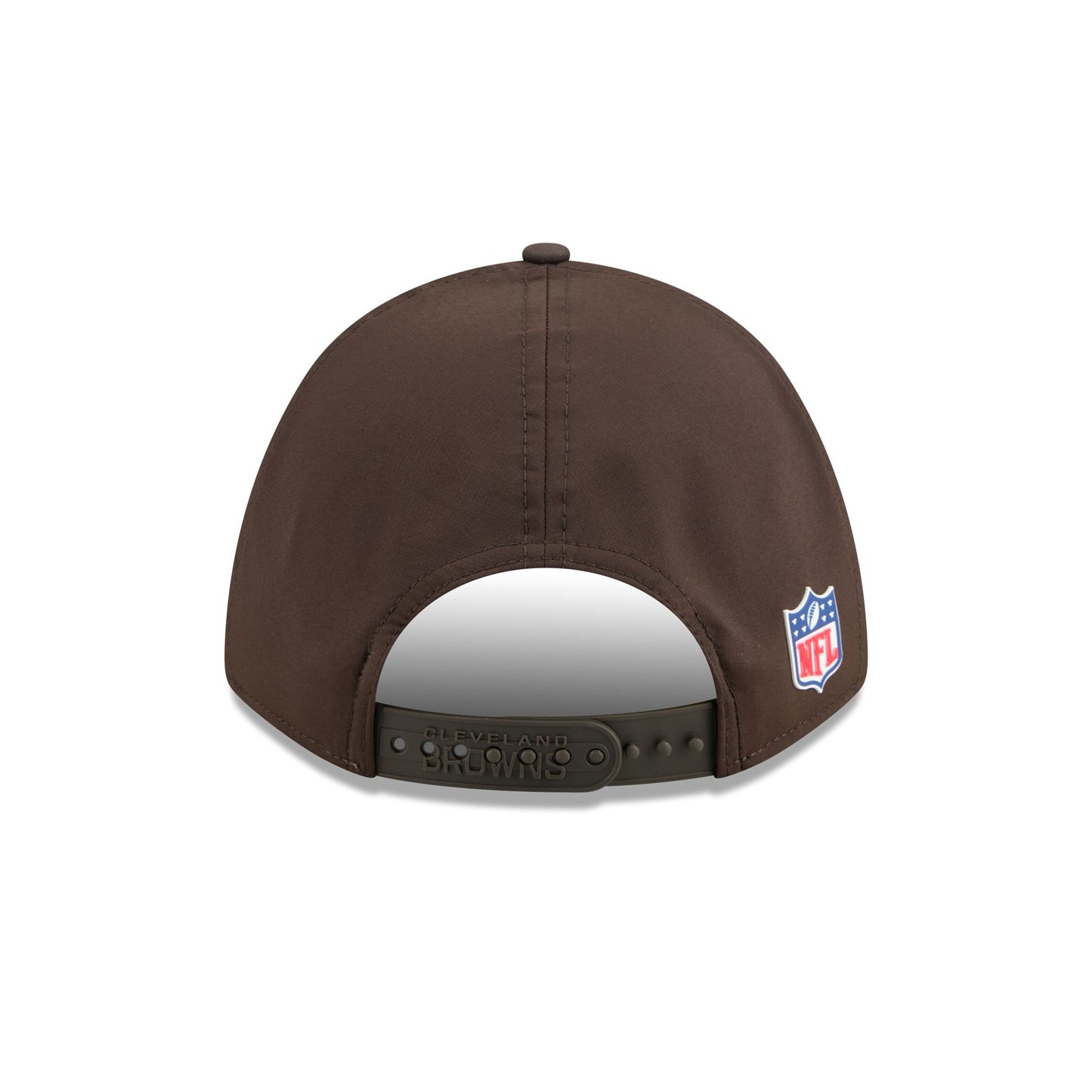 The Cleveland Browns 2025 Sideline Hot Weather 9FORTY M-Crown Snapback features a sewn-down silicone Browns logo patch at the front panels with a water-repellent quill tech fabrication throughout and a quick-dry cushioned sweatband to absorb moisture. Additional details include the Official NFL Shield logo to the right of a soft silicone snapback closure at the rear and mesh accents at the visor sides and side crown panels. The undervisor is accented with a silicone transfer in the team’s colors.