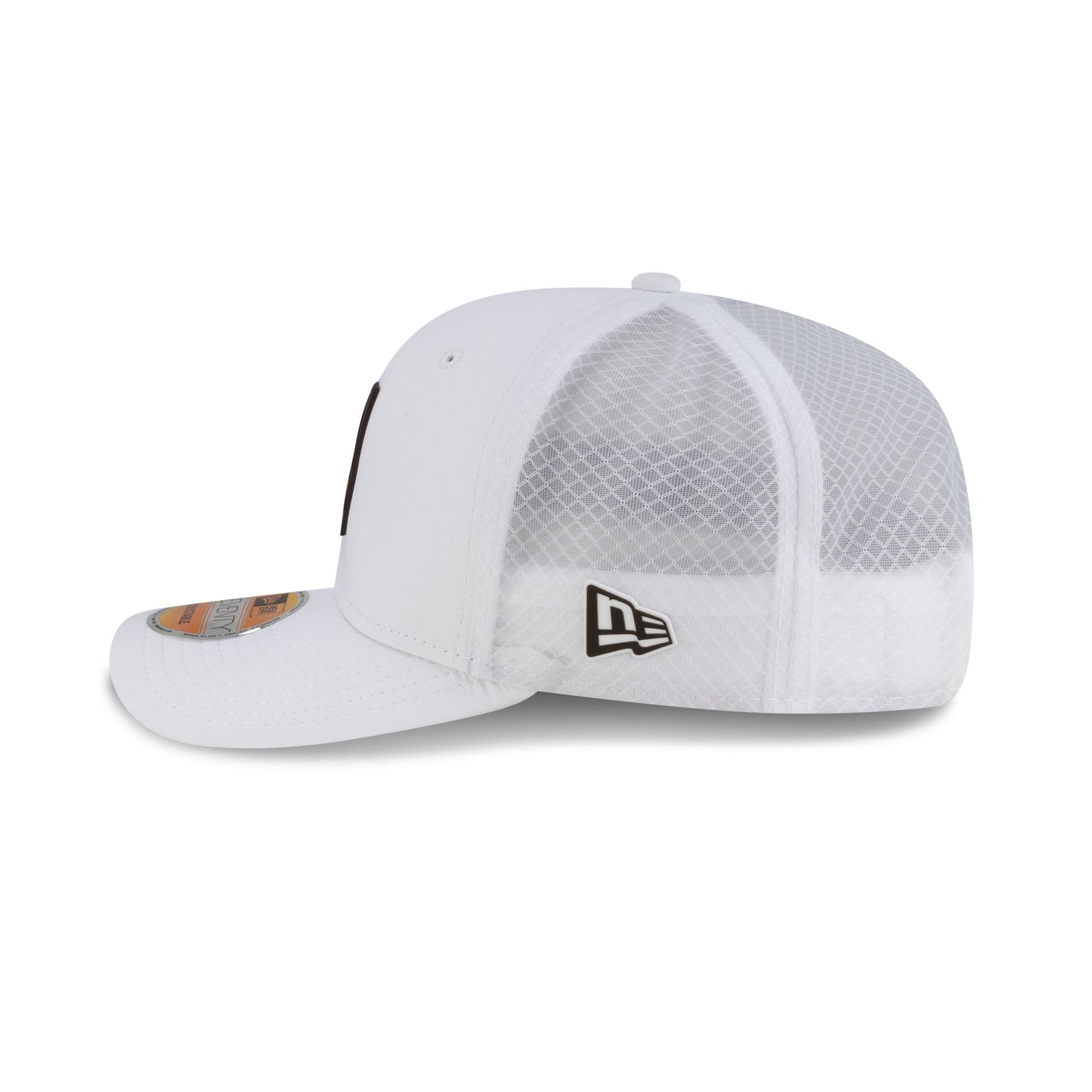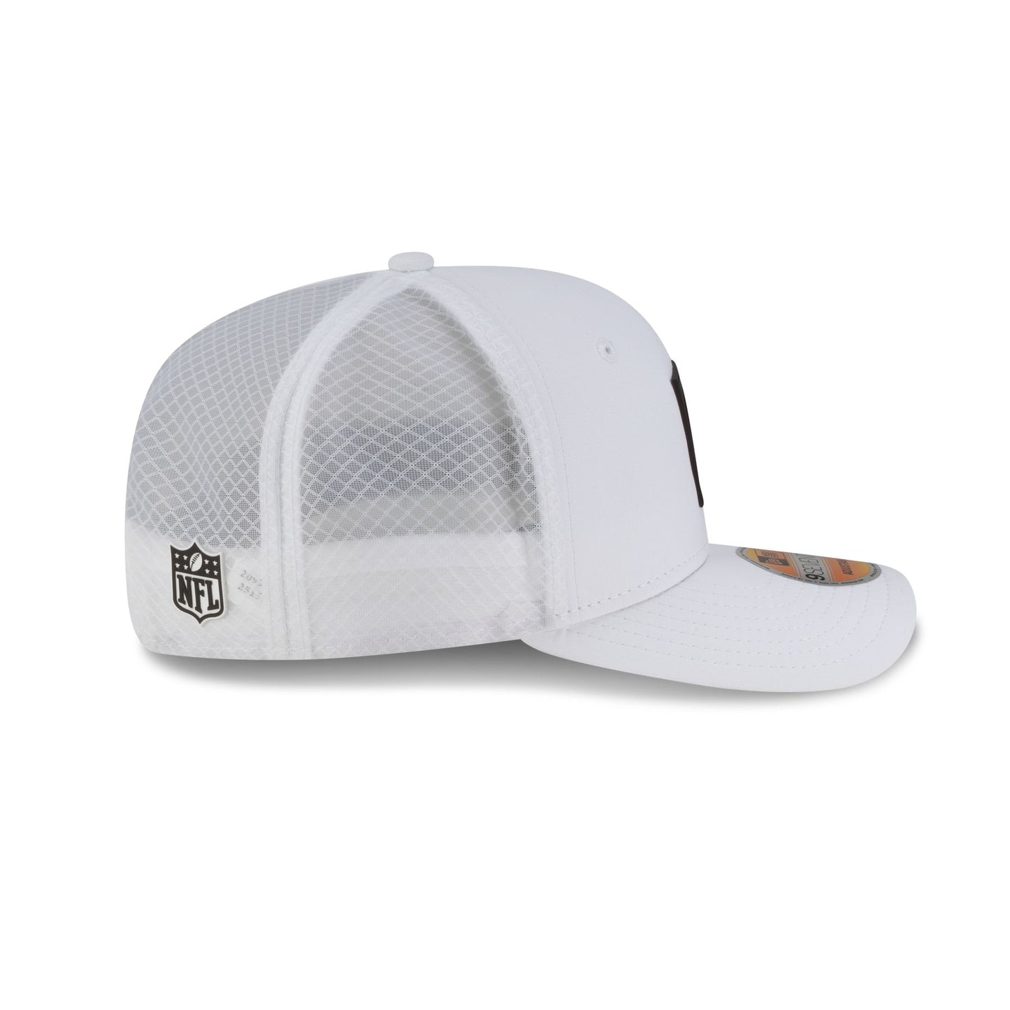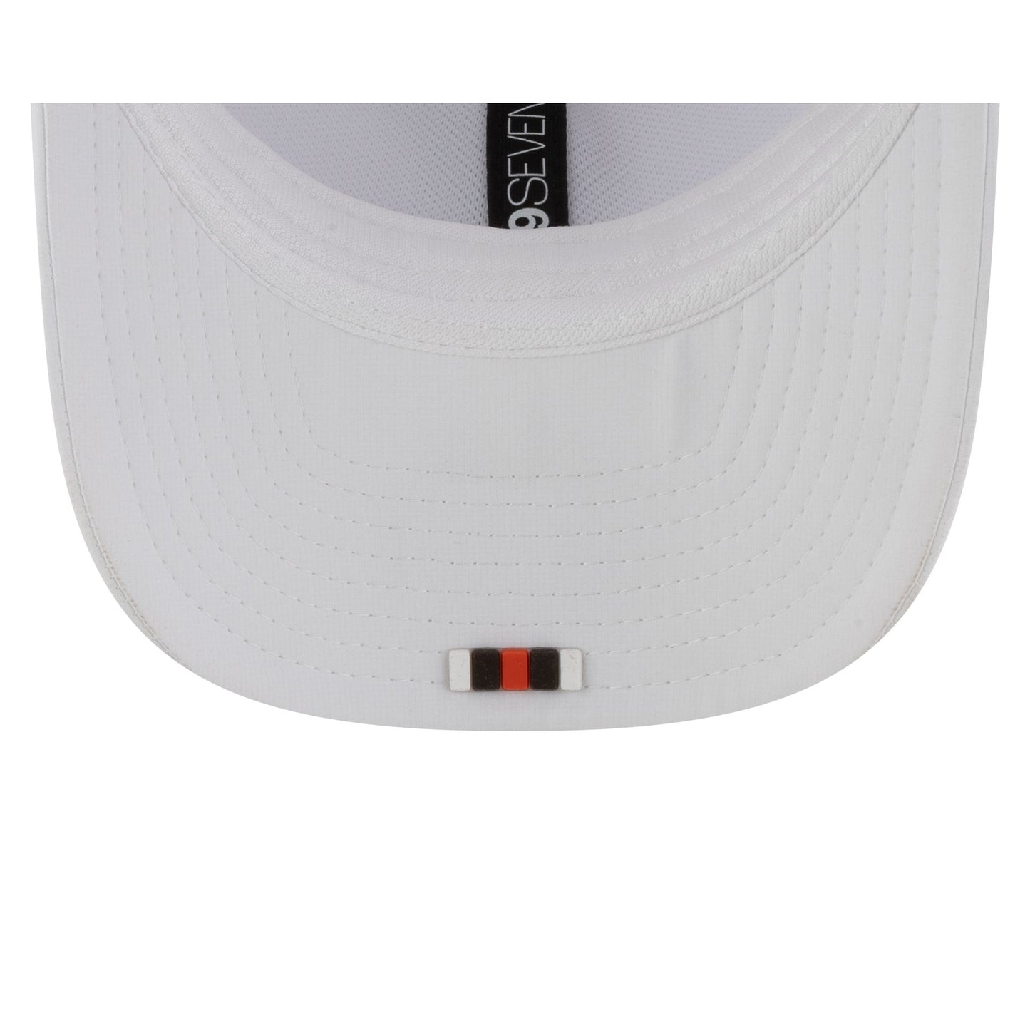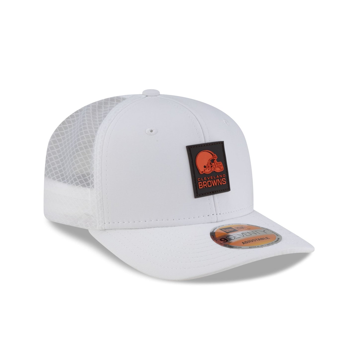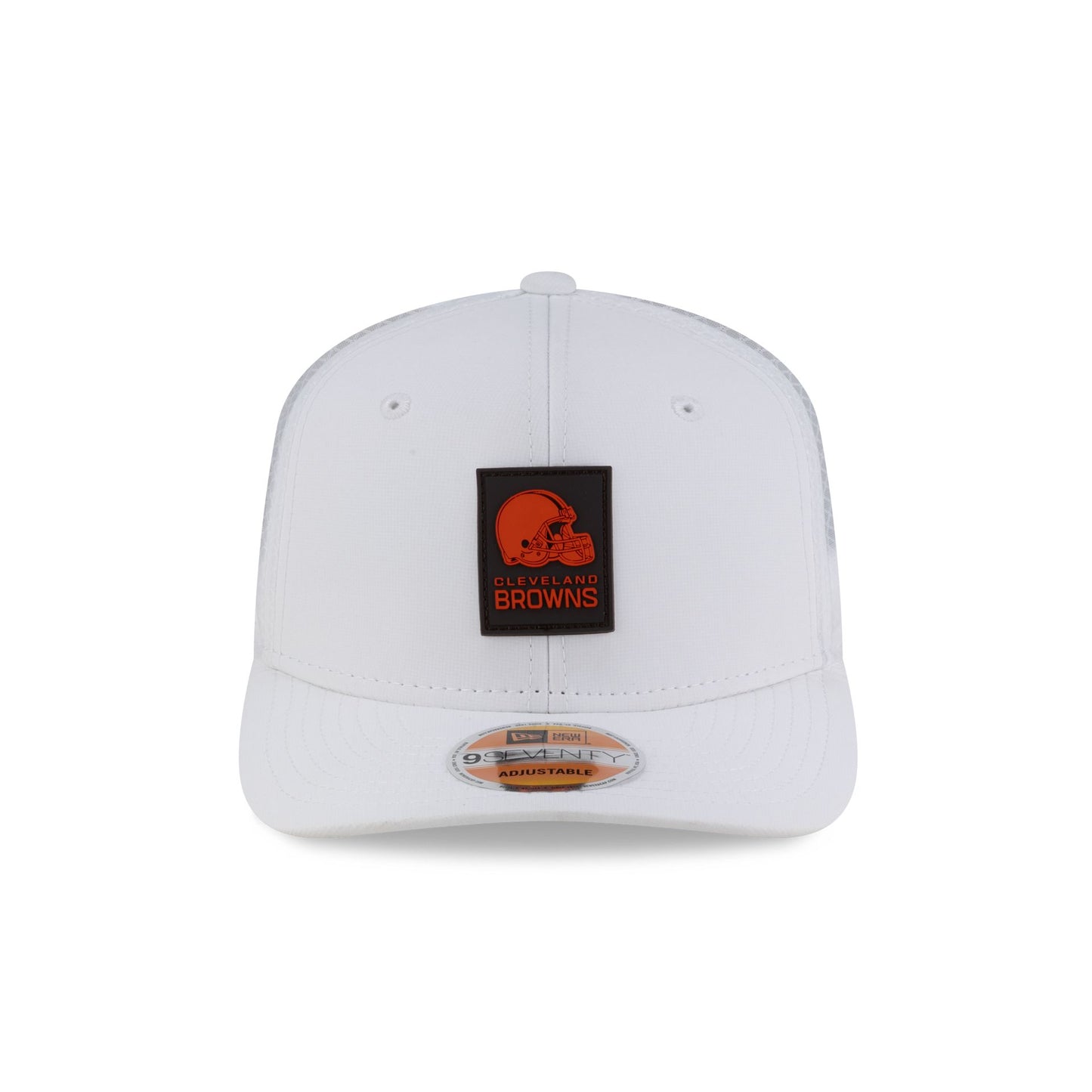 The Cleveland Browns 2025 Sideline Hot Weather White 9SEVENTY Trucker features a sewn-down silicone Browns logo patch at the front panels with a water-repellent quill tech fabrication throughout and a quick-dry cushioned sweatband to absorb moisture. Additional details include the Official NFL Shield logo to the right of a soft silicone snapback closure at a light-weight mesh rear. The undervisor is accented with a silicone transfer in the team’s colors.