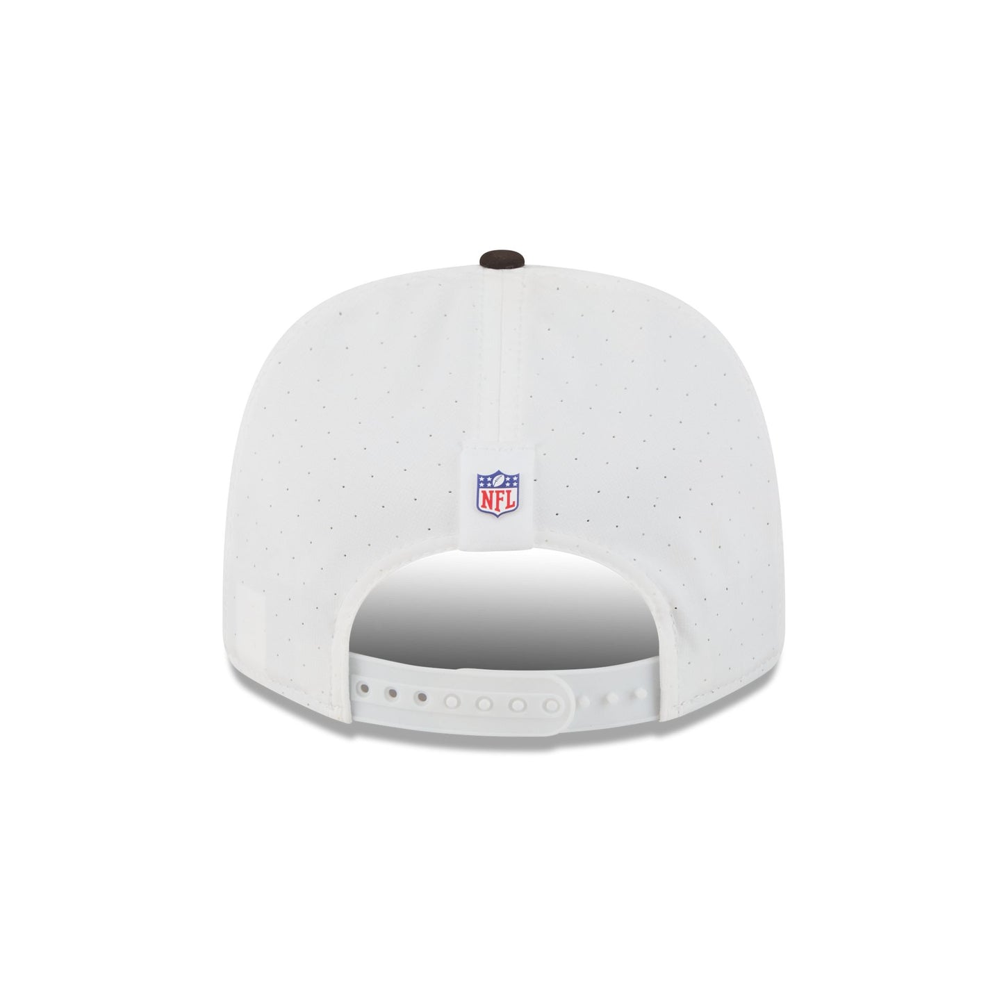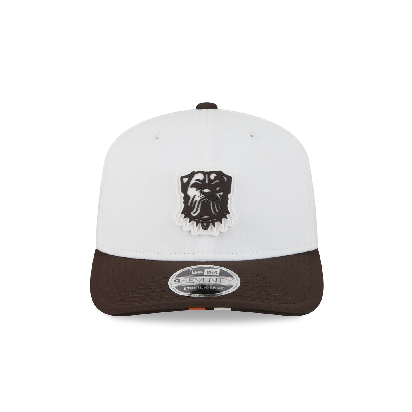 The Cleveland Browns 2025 Training 9SEVENTY Stretch-Snap Cap features a silicone Browns patch at the front panels with team color stripes at the front of a brown visor. Additional details include a silicone NFL Shield patch on a woven foldover tab above a snapback closure at the rear.