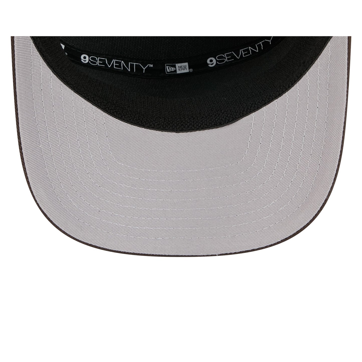 The Cleveland Browns Split Panel 9SEVENTY Stretch-Snap features an embroidered Browns logo at the front panel with a split crown construction and a rope at the visor. Additional details include an adjustable stretch-snap closure at the rear and a gray undervisor.