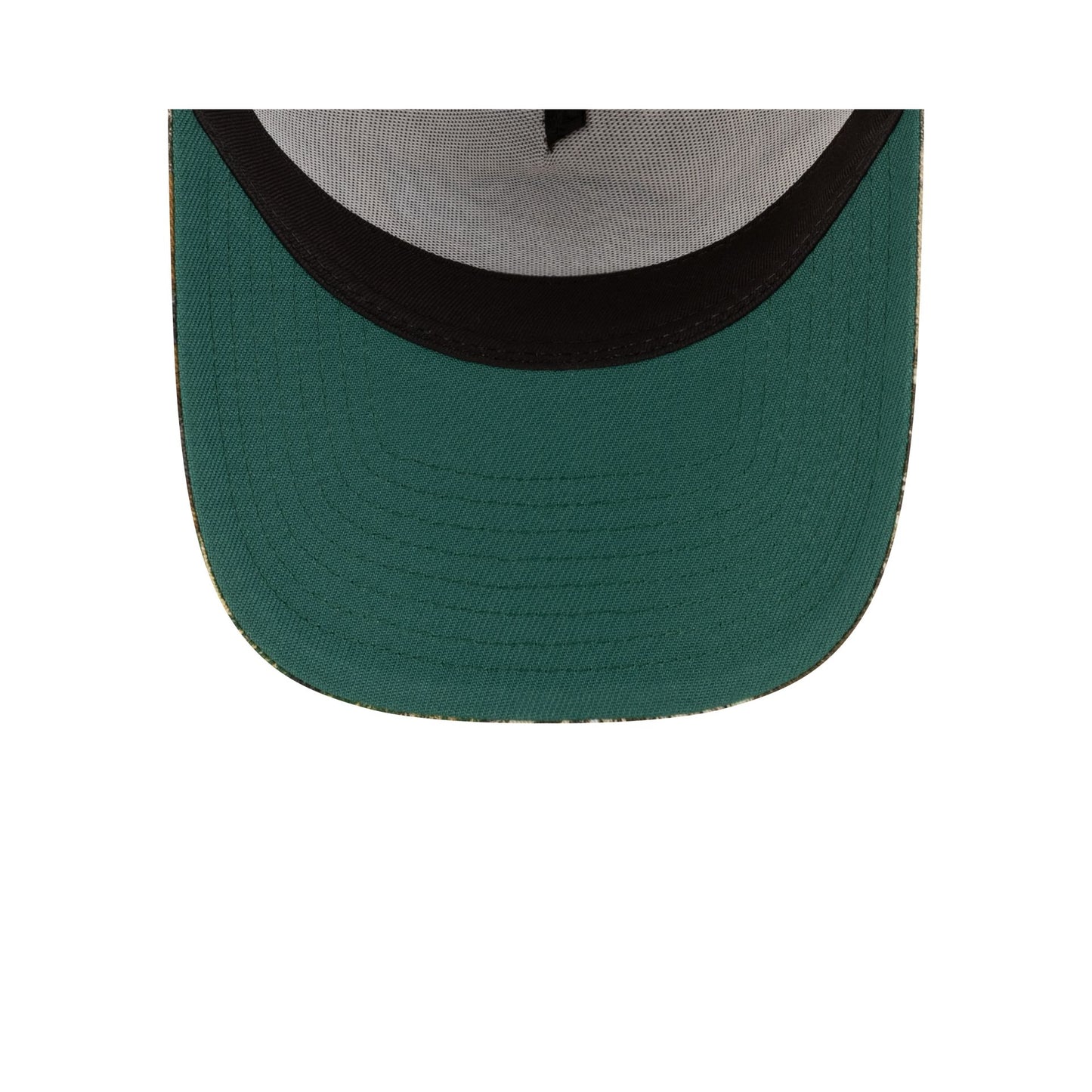 The Cleveland Cavaliers 2010-2017 Hardwood Classics Realtree 9FORTY A-Frame Snapback Cap features an embroidered Cavaliers 2010-2017 Hardwood Classics logo at the front panels with a banner patch at the right-wear side. Additional details include a Realtree camo pattern throughout, an adjustable snapback closure at the rear, and a green undervisor.
