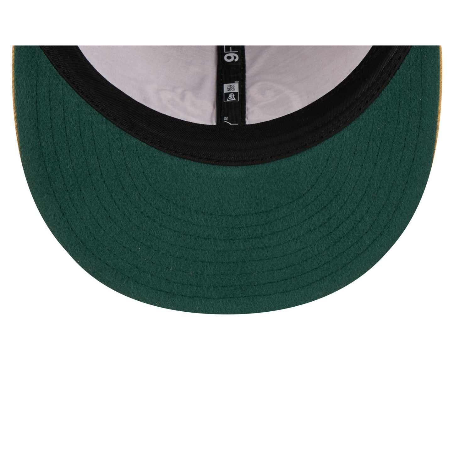 The Cleveland Cavaliers Chainstitch Script Retro Crown 9FIFTY Snapback features a chainstitch embroidered Cavaliers script at the front panels with a matching team logo at the right-wear side, an adjustable snapback closure at the rear, and a green Melton wool undervisor.