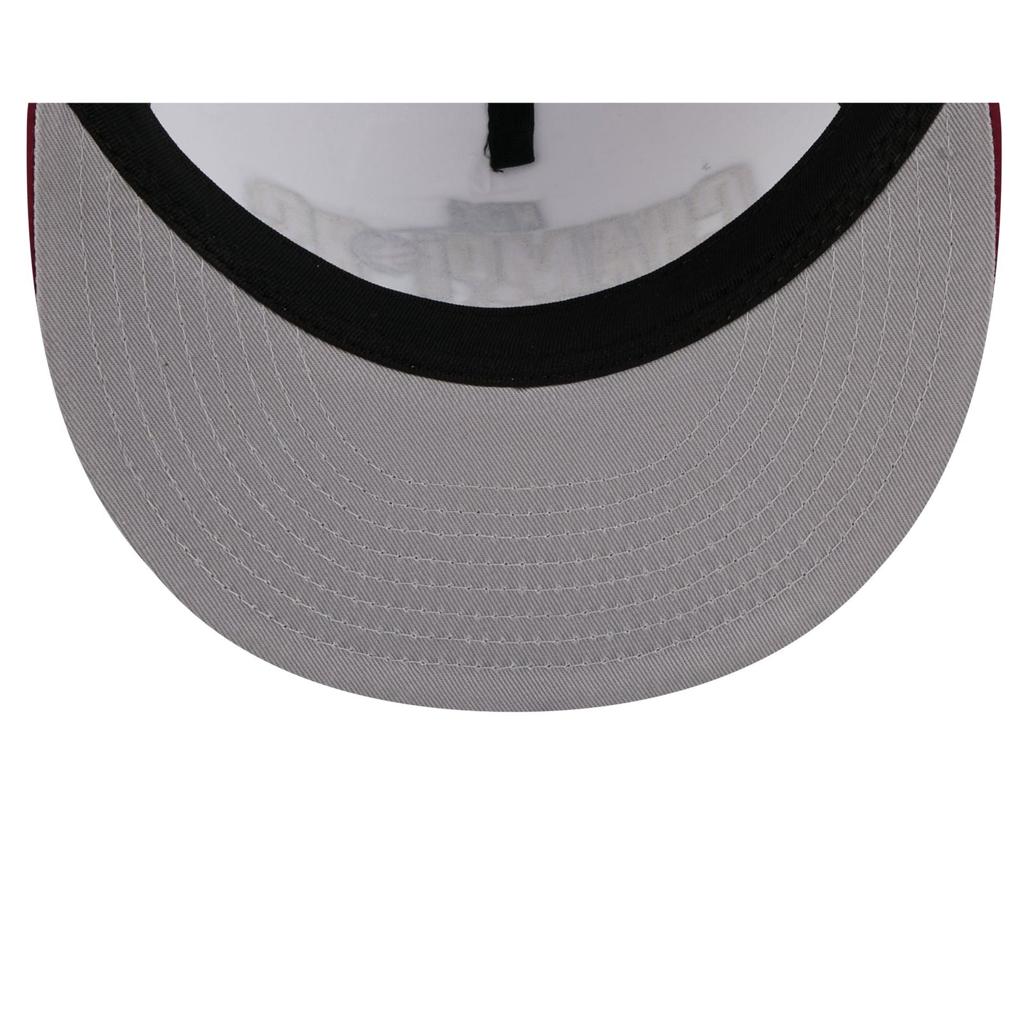 The Cleveland Cavaliers Champions White Retro Crown 59FIFTY Fitted Cap features an embroidered Cavaliers Champions graphic at the front panels with the NBA Logoman at the rear and a gray undervisor.