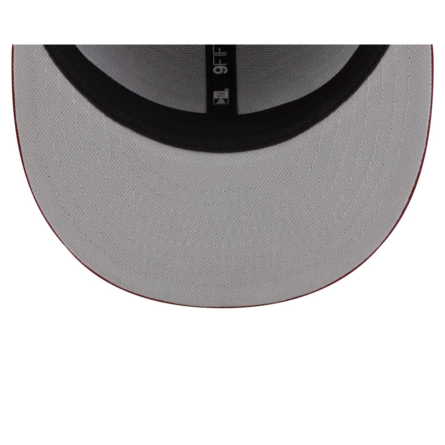 The Cleveland Cavaliers Christmas Day Game 9FIFTY Snapback features an embroidered Cavaliers logo at the front panels with an NBA Logoman snowflake patch at the right-wear side. Additional details include an adjustable white snapback closure at the rear and a gray undervisor.