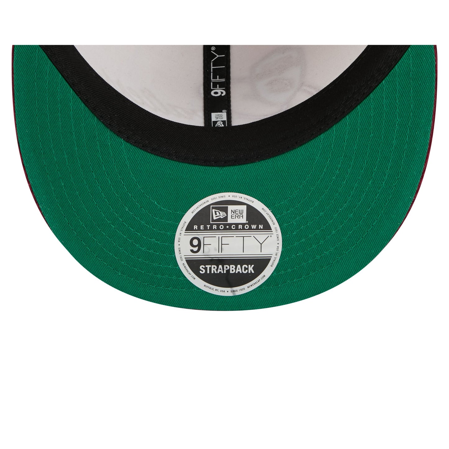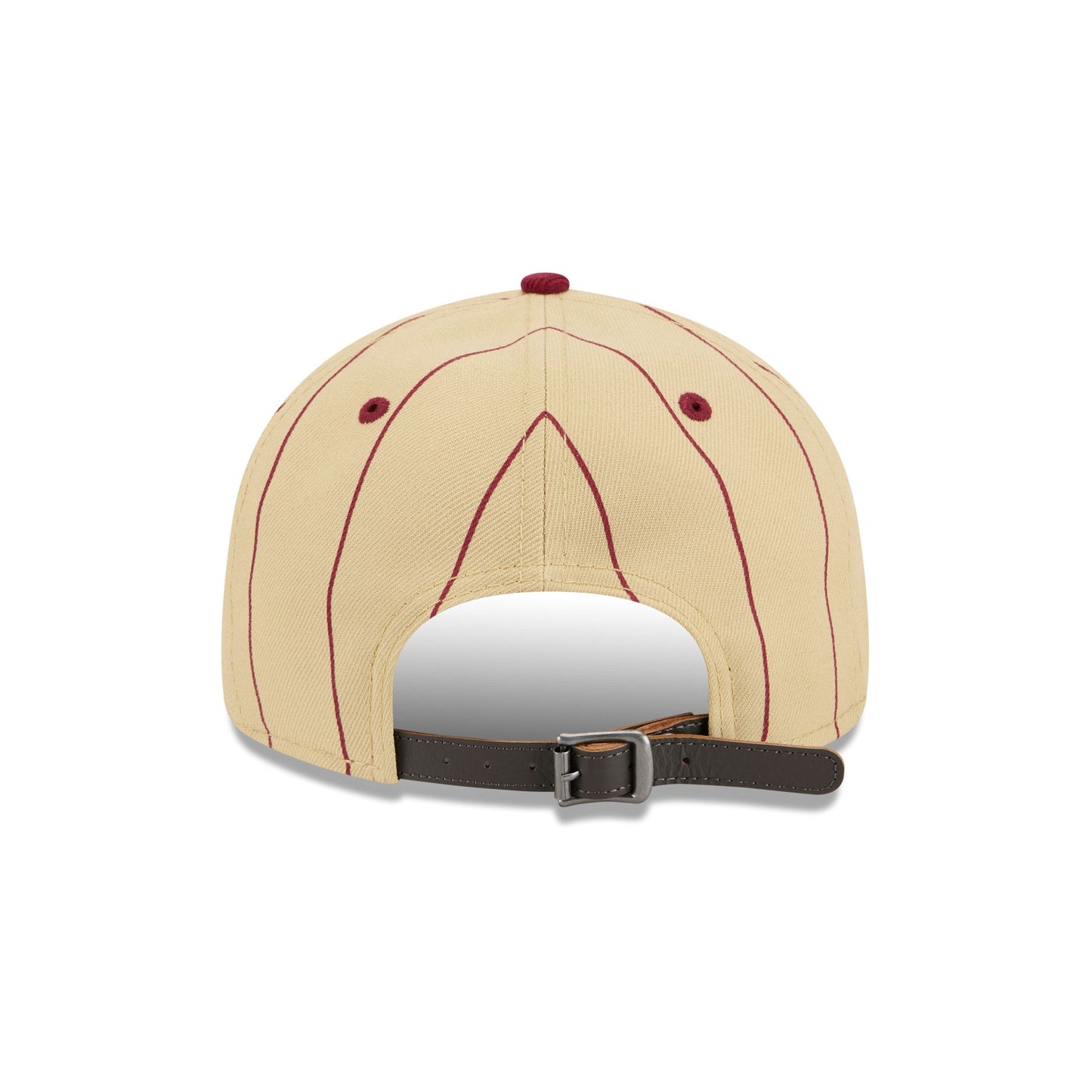 The Cleveland Cavaliers Pinstripe Script Retro Crown 9FIFTY Adjustable Cap features an embroidered Cavaliers logo and cursive wordmark at the front panels wit an adjustable belt closure at the rear and a green undervisor.