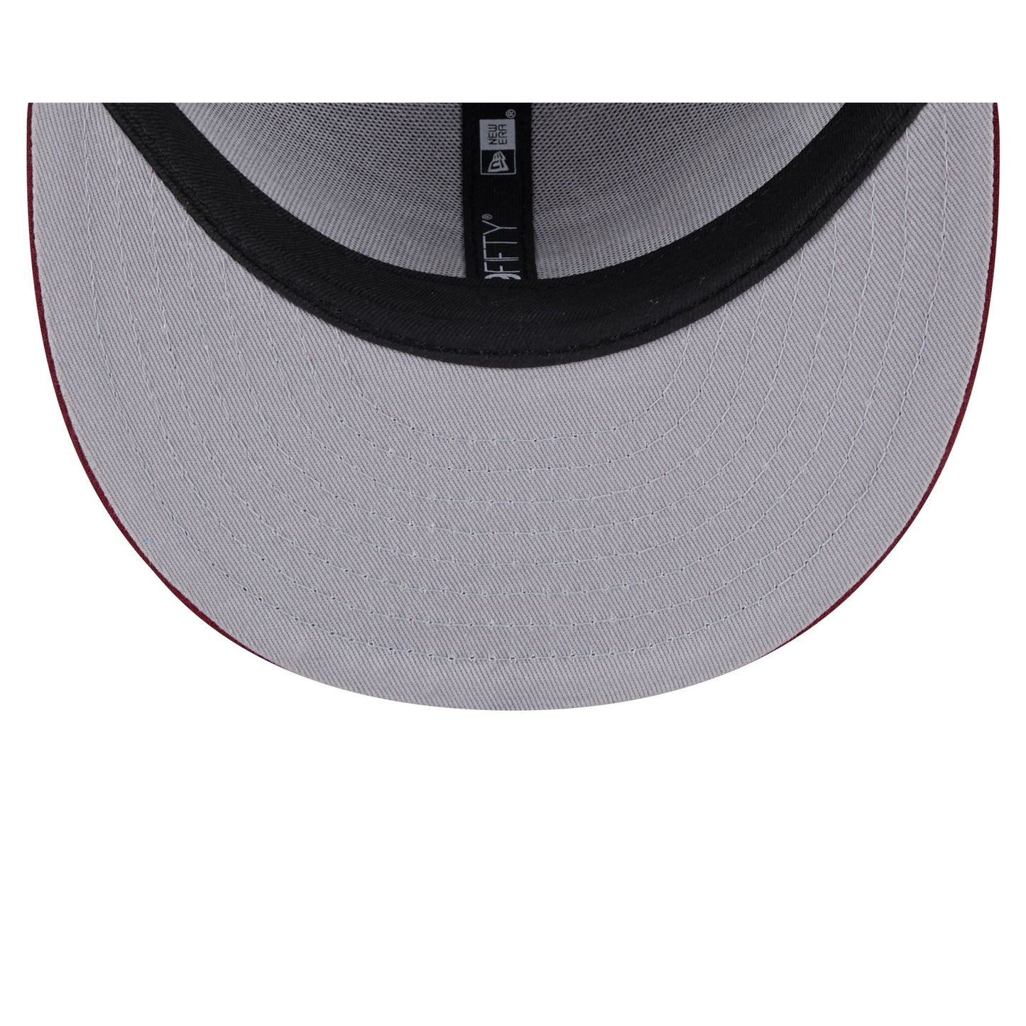 The Cleveland Cavaliers Kids 9FIFTY Snapback Hat features an embroidered Cavaliers wordmark at the front panels with a matching team logo at the right-wear side. Additional details include a gray undervisor and a snapback closure at the rear.