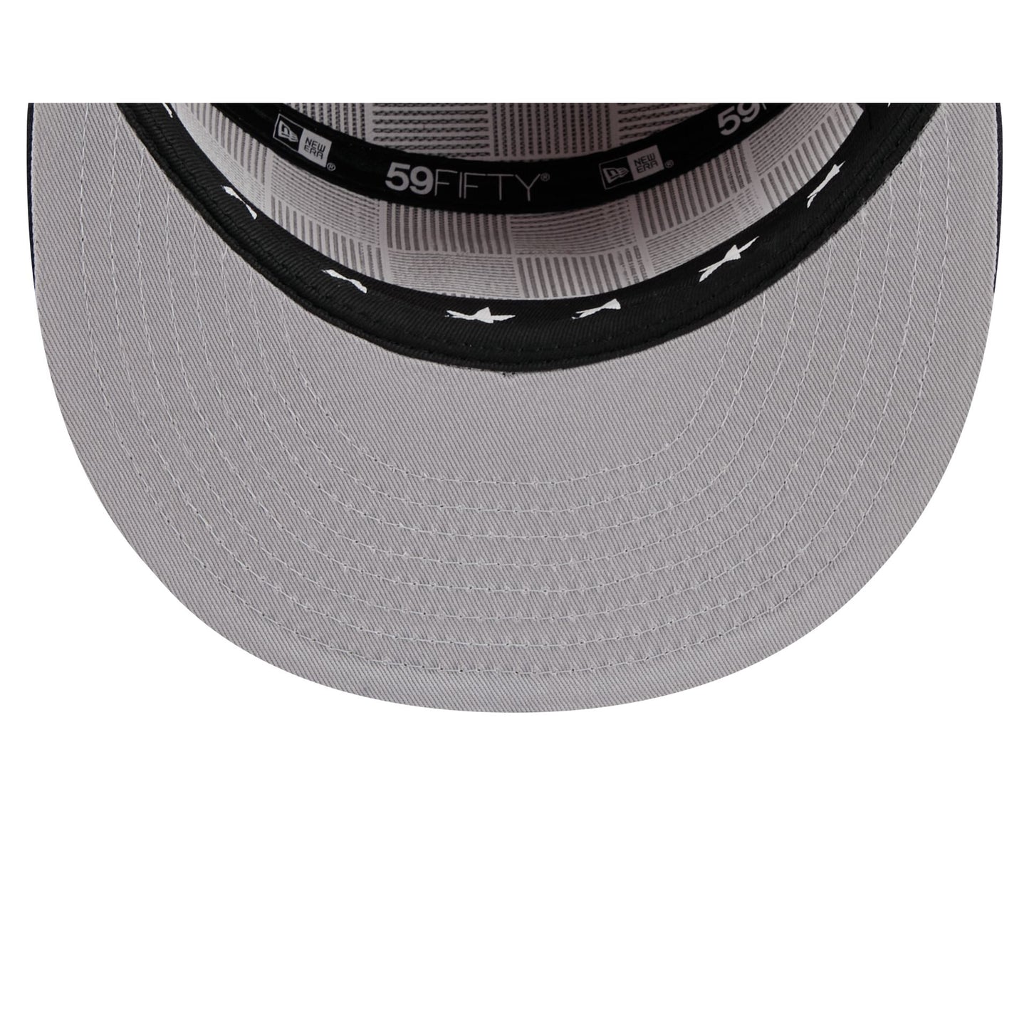 The Cleveland Guardians 2025 All-Star Game Split Panel 59FIFTY Fitted Cap features an embroidered Guardians logo at the front panels against a split-crown construction with breathable mesh fabric at the side and rear panels. Additional details include stars at the top panel, a 2025 All-Star Game patch at the right-wear side, the MLB Batterman logo at the rear, and a gray undervisor. The cap also features screen-printed stars on the sweatband.