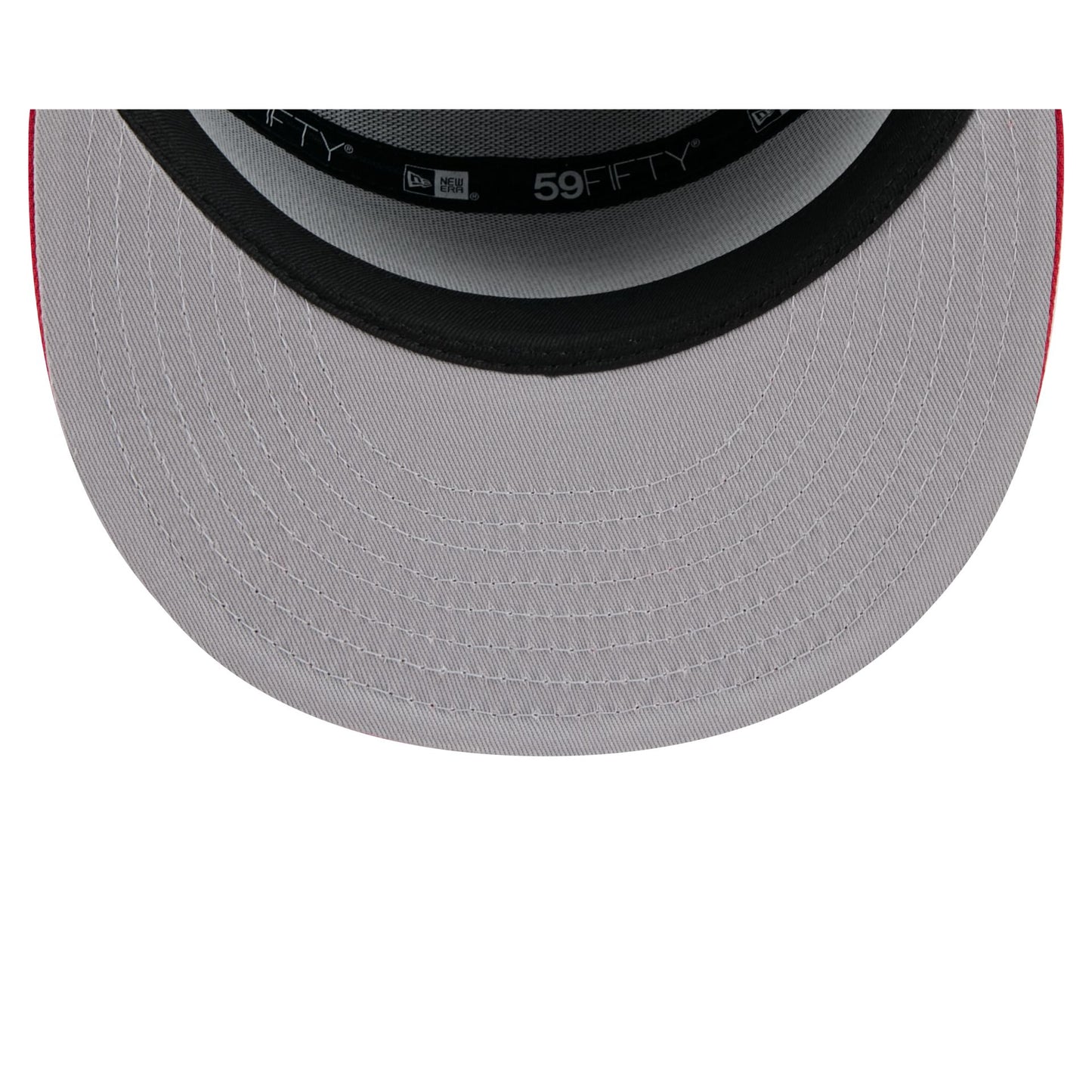 The Cleveland Guardians 2025 All-Star Game Workout Split Panel 59FIFTY Fitted Cap features an embroidered Guardians logo at the front panels against a split-crown construction with breathable mesh fabric at the side and rear panels. Additional details include stars at the top panel, a 2025 All-Star Game patch at the right-wear side, the MLB Batterman logo at the rear, and a gray undervisor.