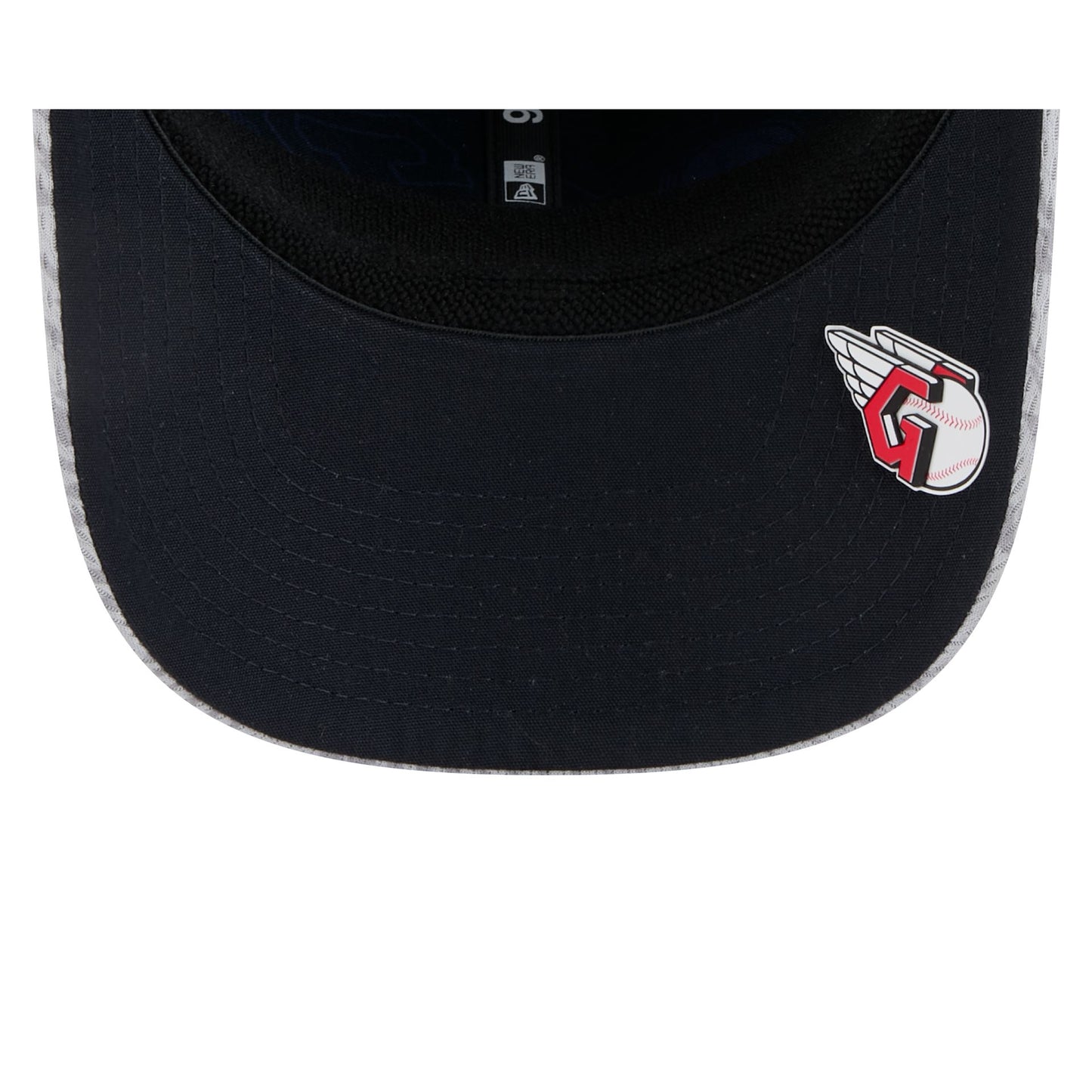 The Cleveland Guardians 2025 Clubhouse Gray 9SEVENTY Stretch-Snap Cap features an embroidered Guardians logo at the front panels with a matching MLB Batterman logo above a snapback closure at the rear and a dashmark mesh fabrication throughout. Additional details include a silicone team tag on the right-wear side and team logo on the undervisor.