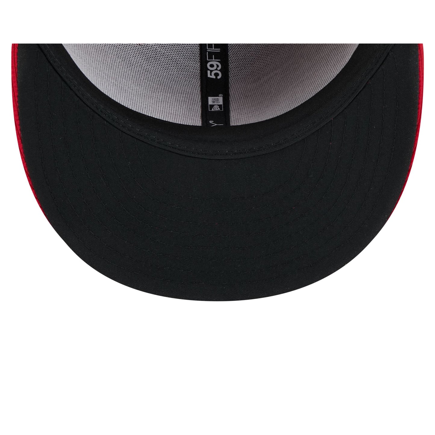 The Cleveland Guardians 2025 Spring Training 59FIFTY Fitted Cap features an embroidered Guardians logo at the front panels with a matching MLB Batterman logo at the rear. Additional details include a pivot knit fabrication with a 2025 Spring Training patch at the right-wear side and a black undervisor.