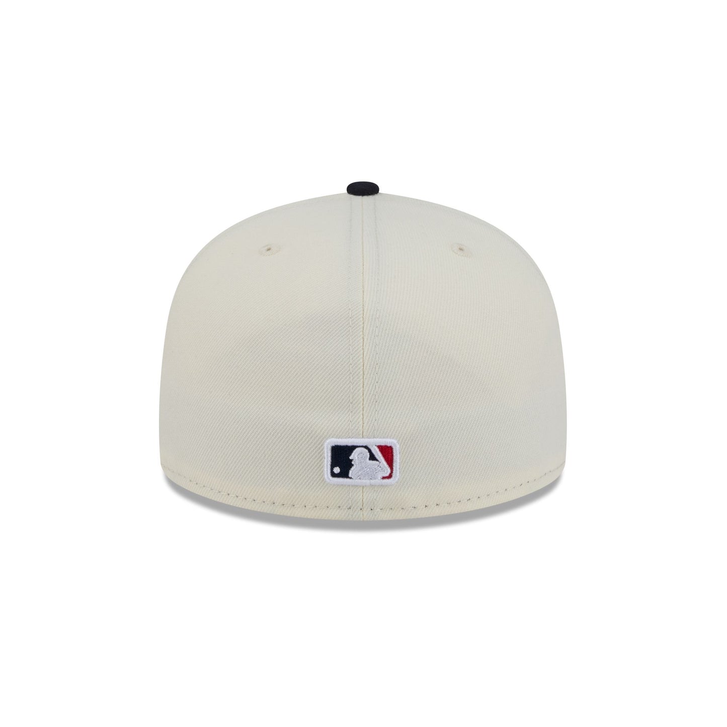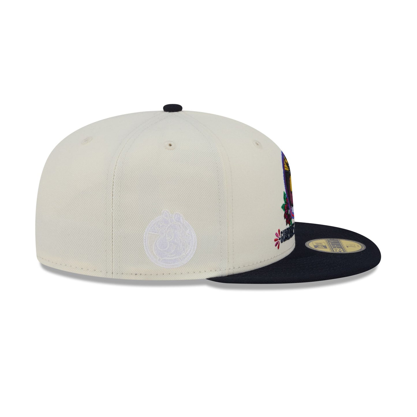 The Cleveland Guardians Day of the Dead Sugar Skull Mascot 59FIFTY Fitted Cap features an embroidered Guardians Mascot with flowers at the front panels with a skeletal mascot at the right-wear side. Additional details include the MLB Batterman logo at the rear and a green undervisor.