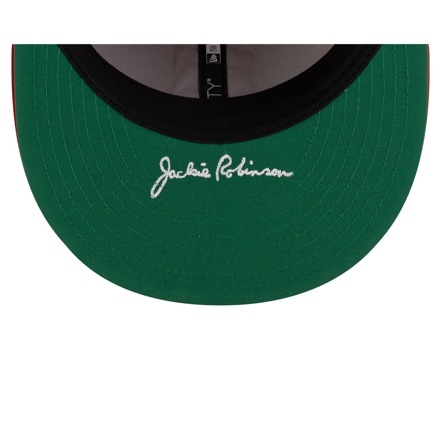 The Cleveland Guardians Jackie Robinson Day 2025 Retro Crown 9FIFTY Snapback features an embroidered Guardians logo at the front panels with an MLB Batterman logo above a snapback closure at the rear. Additional details include a Jackie Robinson pin at the left panel and Robinson's embroidered signature on a green undervisor.