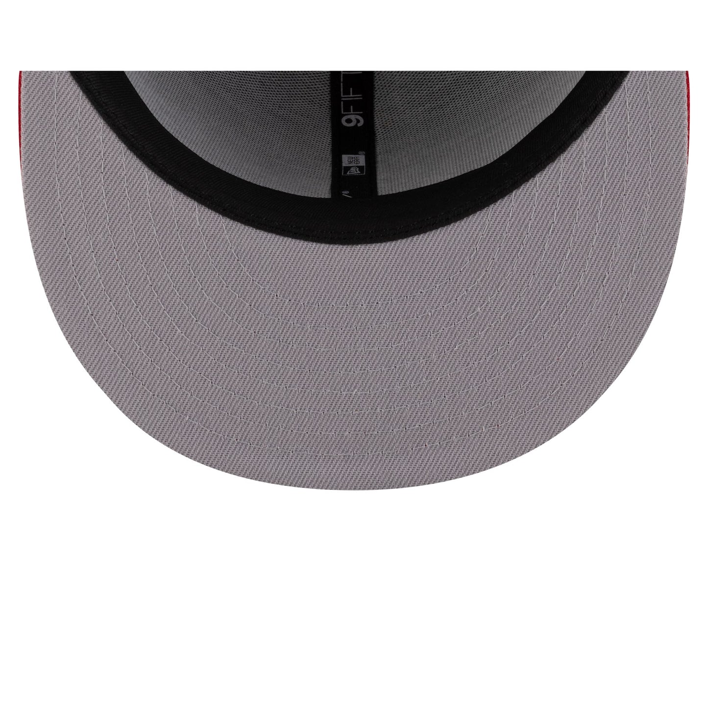 The Cleveland Guardians Mascot Navy 9FIFTY Snapback features an embroidered Guardians mascot at the front panels with a Progressive Field patch at the right-wear side. Additional details include a snapback closure at the rear and a gray undervisor.