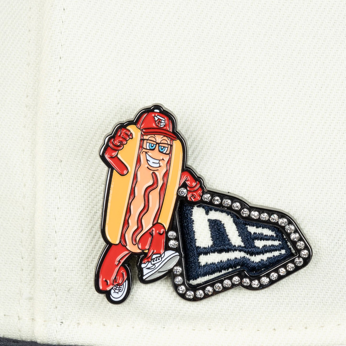 The Cleveland Guardians Mascot Pin 59FIFTY Fitted Cap features an embroidered Guardians logo at the front panels with a matching MLB Batterman logo at the rear. Additional details include a team mascot pin at the left-wear side, a Progressive Field patch at the right-wear side, and a gray undervisor.