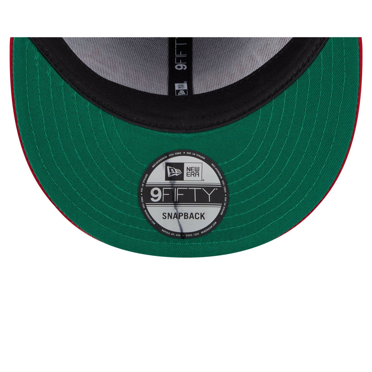 The Cleveland Guardians Satin Pin 9FIFTY Snapback features an embroidered Guardians wordmark at the front panels against a satin fabrication throughout the cap and a logo at the right-wear side. Additional details include a New Era Pin at the front left panel a snapback closure at the rear, and a green undervisor.